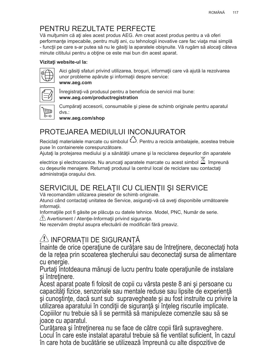 PENTRU REZULTATE PERFECTE Vă mulţumim că aţi ales acest produs AEG. Am creat acest produs pentru a vă oferi performanţe impecabile, pentru mulţi ani, cu tehnologii inovative care fac viaţa mai simplă - funcţii pe care s-ar putea să nu le găsiţi la aparatele obişnuite. Vă rugăm să alocaţi câteva minute cititului pentru a obţine ce este mai bun din acest aparat. Vizitaţi website-ul la: Aici găsiţi sfaturi privind utilizarea, broşuri, informaţii care vă ajută la rezolvarea unor probleme apărute şi informaţii despre service: www.aeg.com Înregistraţi-vă produsul pentru a beneficia de servicii mai bune: www.aeg.com/productregistration Cumpăraţi accesorii, consumabile şi piese de schimb originale pentru aparatul dvs.: www.aeg.com/shop
