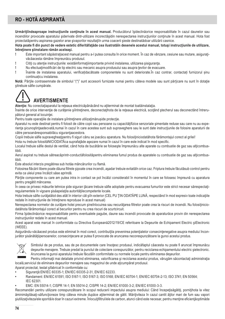 Les enfants doivent être surveillés afin qu’ils ne jouent pas avec l’appareil. Ne jamais utiliser la hotte sans que la grille ne soit montée correctement! La hotte ne doit JAMAIS être utilisée comme plan pour déposer quelque chose sauf si cela est expressément indiqué. Quand la hotte est utilisée en même temps que d’autres appareils à combustion de gaz ou d’autres combustibles, le local doit disposer d’une ventilation suffisante. L’air aspiré ne doit jamais être envoyé dans un conduit utilisé pour l’évacuation des fumées produites par des appareils à combustion de gaz ou d’autres combustibles. Il est formellement interdit de faire flamber les aliments sous la hotte. L’utilisation de flammes libres peut entraîner des dégâts aux filtres et peut donner lieu à des incendies, il faut donc les éviter à tout prix. La friture d’aliments doit être réalisée sous contrôle pour éviter que l’huile surchauffée ne prenne feu. Les pièces accessibles peuvent se réchauffer de façon importante quand elles sont utilisées avec des appareils pour la cuisson. En ce qui concerne les mesures techniques et de sécurité à adopter pour l’évacuation des fumées, s’en tenir strictement à ce qui est prévu dans les règlements des autorités locales compétentes. La hotte doit être régulièrement nettoyée, aussi bien à l’intérieur qu’à l’extérieur (AU MOINS UNE FOIS PAR MOIS, respecter néanmoins les instructions relatives à l’entretien fournies dans ce manuel). La non observation de ces normes de nettoyage de la hotte et du changement et nettoyage des filtres comporte des risques d’incendie. Ne pas utiliser ou laisser la hotte sans que les ampoules soient correctement placées pour éviter tout risque de choc électrique. La société décline toute responsabilité pour d’éventuels inconvénients, dégâts ou incendies provoqués par l’appareil et dérivés de la non observation des instructions reprises dans ce manuel. Cet appareil porte le symbole du recyclage conformément à la Directive Européenne 2012/19/CE concernant les Déchets d’Équipements Électriques et Électroniques (DEEE ou WEEE). En procédant correctement à la mise au rebut de cet appareil, vous contribuerez à empêcher toute conséquence nuisible pour l’environnement et la santé de l’homme. Le symbole présent sur l’appareil ou sur la documentation qui l’accompagne indique que ce produit ne peut en aucun cas être traité comme déchet ménager. Il doit par conséquent être remis à un centre de collecte des déchets chargé du recyclage des équipements électriques et électroniques. Pour la mise au rebut, respectez les normes relatives à l’élimination des déchets en vigueur dans le pays d’installation. Pour obtenir de plus amples détails au sujet du traitement, de la récupération et du recyclage de cet appareil, veuillez vous adresser au bureau compétent de votre commune, à la société de collecte des déchets ou directement à votre revendeur.