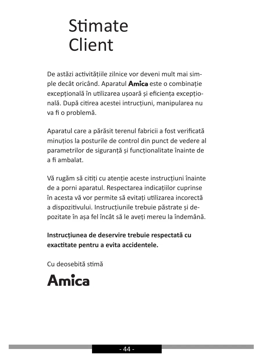 Stimate Client De astăzi activitățiile zilnice vor deveni mult mai simple decât oricând. Aparatul este o combinație excepțională în utilizarea ușoară și eficienţa excepțională. După citirea acestei intrucțiuni, manipularea nu va fi o problemă. Aparatul care a părăsit terenul fabricii a fost verificată minuţios la posturile de control din punct de vedere al parametrilor de siguranţă şi funcţionalitate înainte de a fi ambalat. Vă rugăm să citiţi cu atenţie aceste instrucţiuni înainte de a porni aparatul. Respectarea indicaţiilor cuprinse în acesta vă vor permite să evitaţi utilizarea incorectă a dispozitivului. Instrucţiunile trebuie păstrate şi depozitate în aşa fel încât să le aveţi mereu la îndemână. Instrucţiunea de deservire trebuie respectată cu exactitate pentru a evita accidentele. Cu deosebită stimă