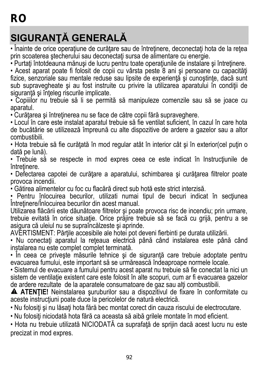 • Les enfants ne doivent pas jouer avec l’appareil. • Le nettoyage et l’entretien par l’usager ne doivent pas être effectués par des enfants sans surveillance. • La pièce doit avoir une aération suffisante lorsque la hotte est utilisée conjointement avec d'autres appareils fonctionnant au gaz ou autres combustibles. • La hotte doit être régulièrement nettoyée à la fois à l'intérieur et à l'extérieur (AU MOINS UNE FOIS PAR MOIS); cela devrait se faire en conformité avec les instructions d'entretien. Le non respect des instructions expressément fournies concernant le nettoyage de la hotte et des filtres peut provoquer des risques d'incendie. • Ne pas flamber d’aliments sous la hotte. • Pour le remplacement de la lampe, utilisez uniquement le type de lampe spécifié dans la section remplacement/maintenance lampe dans ce manuel. L'utilisation d'une flamme nue est dommageable pour les filtres et peut causer un incendie, par conséquent, il est déconseillé de l'utiliser. La friture doit être faite avec soin afin de s’assurer que l’huile surchauffée ne prenne pas feu. AVERTISSEMENT: Lorsque la table de cuisson est en fonctionnement, les parties accessibles de la hotte peuvent devenir très chaudes. • Ne pas brancher l'appareil au réseau électrique avant que l'installation ne soit complètement terminée. • En ce qui concerne les mesures techniques et de sécurité à prendre pour l'évacuation des fumées, respectez strictement les dispositions des règlements locales. • L’air ne doit pas être envoyé dans un conduit utilisé pour évacuer les fumées d’appareils utilisant du gaz ou un autre combustible. ATTENTION ! Le défaut d'installer les vis et les dispositifs de fixation conformément à ces instructions peut entraîner des risques électriques. • Ne pas utiliser ou laisser la hotte sans les lampes correctement montées, car un éventuel risque de choc électrique est possible. • N’utilisez jamais la hotte sans la grille montée correctement! • La hotte ne doit JAMAIS être utilisée comme une surface d'appui, sauf indication expresse. 19