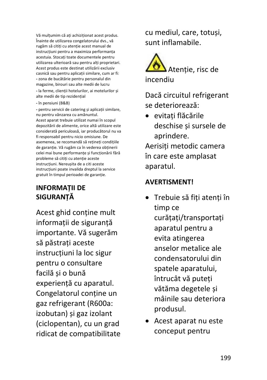 • Ne pas utiliser de dispositifs mécaniques ou d'autre équipement pour accélérer le processus de dégivrage. • Éviter impérativement l'utilisation de flamme nue ou d’un équipement électrique, comme des radiateurs, des nettoyeurs à vapeur, des bougies, des lampes à pétrole ou similaires pour accélérer la phase de dégivrage.