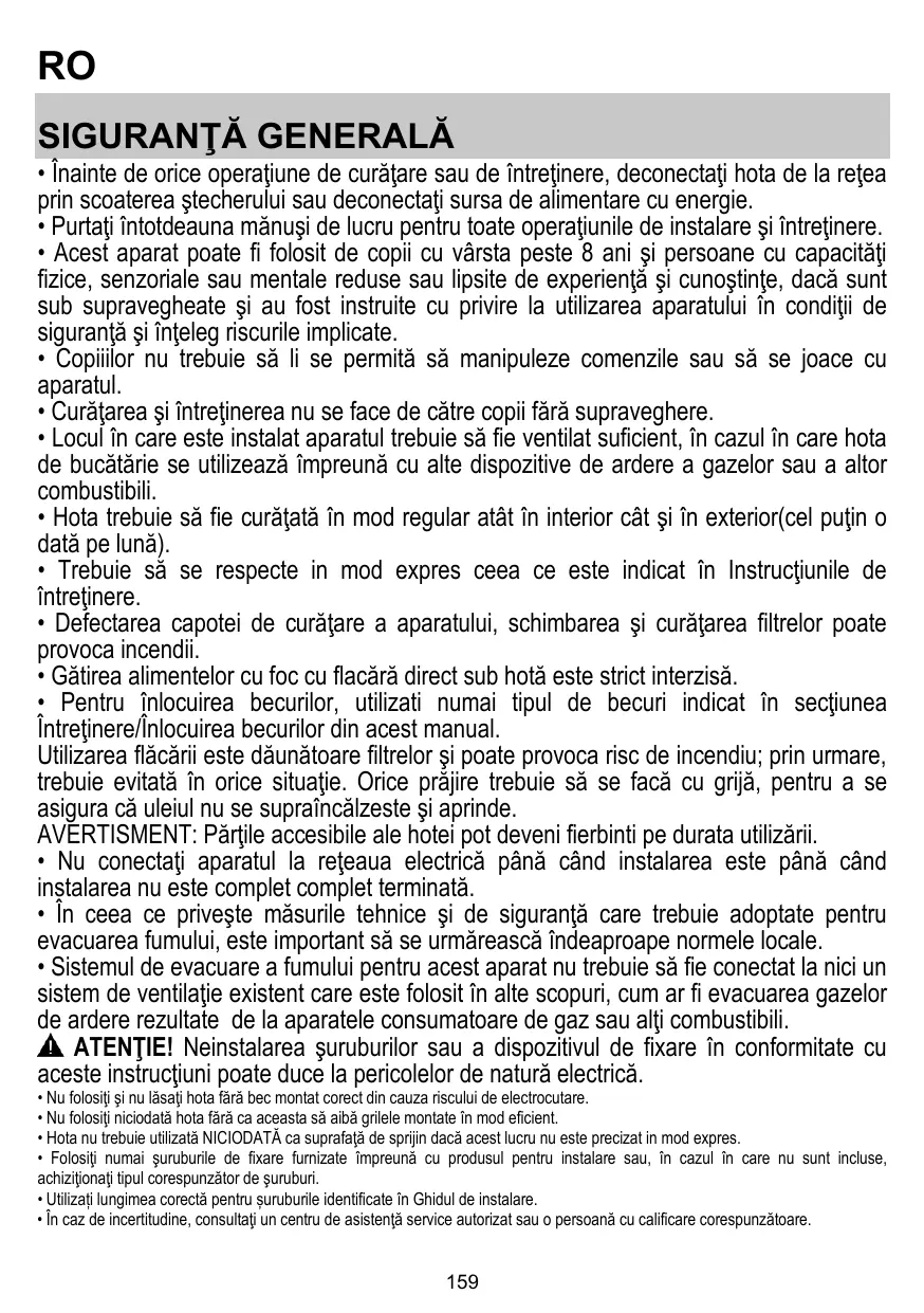 Cosa si può fare se la spia dello stato di connessione continua a lampeggiare lentamente e non rimane accesa in modo fisso, o se non si riesce a stabilire una connessione stabile con il router domestico? È possibile che l'apparecchio si colleghi al router ma non riesca ad accedere a Internet. Per collegare l'apparecchio a Internet, controllare le impostazioni del router e/o della linea. Impostazioni del router: NAT deve essere attivo, Firewall e DHCP devono essere configurati correttamente. Tipi di crittografia supportati per le password: WEP, WPA,WPA2. Se si desidera usare un tipo di crittografia differente, consultare il manuale del router. Impostazioni della linea: se il provider del servizio Internet ha stabilito il numero di indirizzi MAC che possono collegarsi a Internet, può darsi che non si riesca a collegare l'apparecchio al cloud. L'indirizzo MAC è un identificatore univoco ed è diverso per ogni dispositivo. Si dovrà chiedere al provider la procedura da seguire per collegare a Internet altri dispositivi diversi dai computer. Come si può controllare se i dati vengono trasmessi? Dopo avere configurato la rete, spegnere l'apparecchio, attendere 20 secondi e riaccenderlo: verificare che l'app mostri lo stato dell'interfaccia utente dell'apparecchio. • Les enfants ne doivent pas jouer avec l’appareil. • Le nettoyage et l’entretien par l’usager ne doivent pas être effectués par des enfants sans surveillance. • La pièce doit avoir une aération suffisante lorsque la hotte est utilisée conjointement avec d'autres appareils fonctionnant au gaz ou autres combustibles. • La hotte doit être régulièrement nettoyée à la fois à l'intérieur et à l'extérieur (AU MOINS UNE FOIS PAR MOIS); cela devrait se faire en conformité avec les instructions d'entretien. Le non respect des instructions expressément fournies concernant le nettoyage de la hotte et des filtres peut provoquer des risques d'incendie. • Ne pas flamber d’aliments sous la hotte. • Pour le remplacement de la lampe, utilisez uniquement le type de lampe spécifié dans la section remplacement/maintenance lampe dans ce manuel. L'utilisation d'une flamme nue est dommageable pour les filtres et peut causer un incendie, par conséquent, il est déconseillé de l'utiliser. La friture doit être faite avec soin afin de s’assurer que l’huile surchauffée ne prenne pas feu. AVERTISSEMENT: Lorsque la table de cuisson est en fonctionnement, les parties accessibles de la hotte peuvent devenir très chaudes. • Ne pas brancher l'appareil au réseau électrique avant que l'installation ne soit complètement terminée. • En ce qui concerne les mesures techniques et de sécurité à prendre pour l'évacuation des fumées, respectez strictement les dispositions des règlements locales. • L’air ne doit pas être envoyé dans un conduit utilisé pour évacuer les fumées d’appareils utilisant du gaz ou un autre combustible. ATTENTION ! Le défaut d'installer les vis et les dispositifs de fixation conformément à ces instructions peut entraîner des risques électriques.