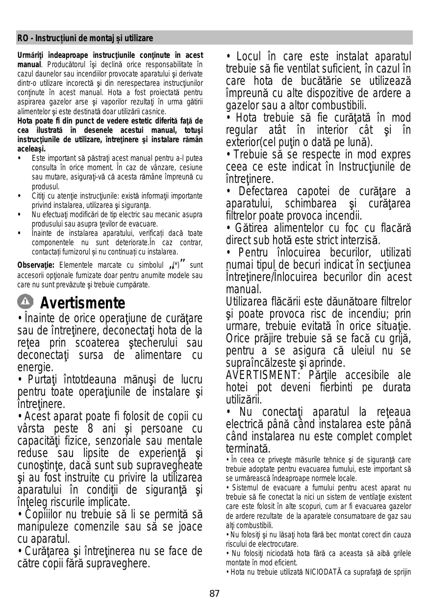 • La hotte doit être régulièrement nettoyée à la fois à l'intérieur et à l'extérieur (AU MOINS UNE FOIS PAR MOIS); cela devrait se faire en conformité avec les instructions d'entretien. Le non respect des instructions expressément fournies concernant le nettoyage de la hotte et des filtres peut provoquer des risques d'incendie. • Ne pas flamber d’aliments sous la hotte. • Pour le remplacement de la lampe, utilisez uniquement le type de lampe spécifié dans la section remplacement/maintenance lampe dans ce manuel. L'utilisation d'une flamme nue est dommageable pour les filtres et peut causer un incendie, par conséquent, il est déconseillé de l'utiliser. La friture doit être faite avec soin afin de s’assurer que l’huile surchauffée ne prenne pas feu. AVERTISSEMENT: Lorsque la table de cuisson est en fonctionnement, les parties accessibles de la hotte peuvent devenir très chaudes. • Ne pas brancher l'appareil au réseau électrique avant que l'installation ne soit complètement terminée.