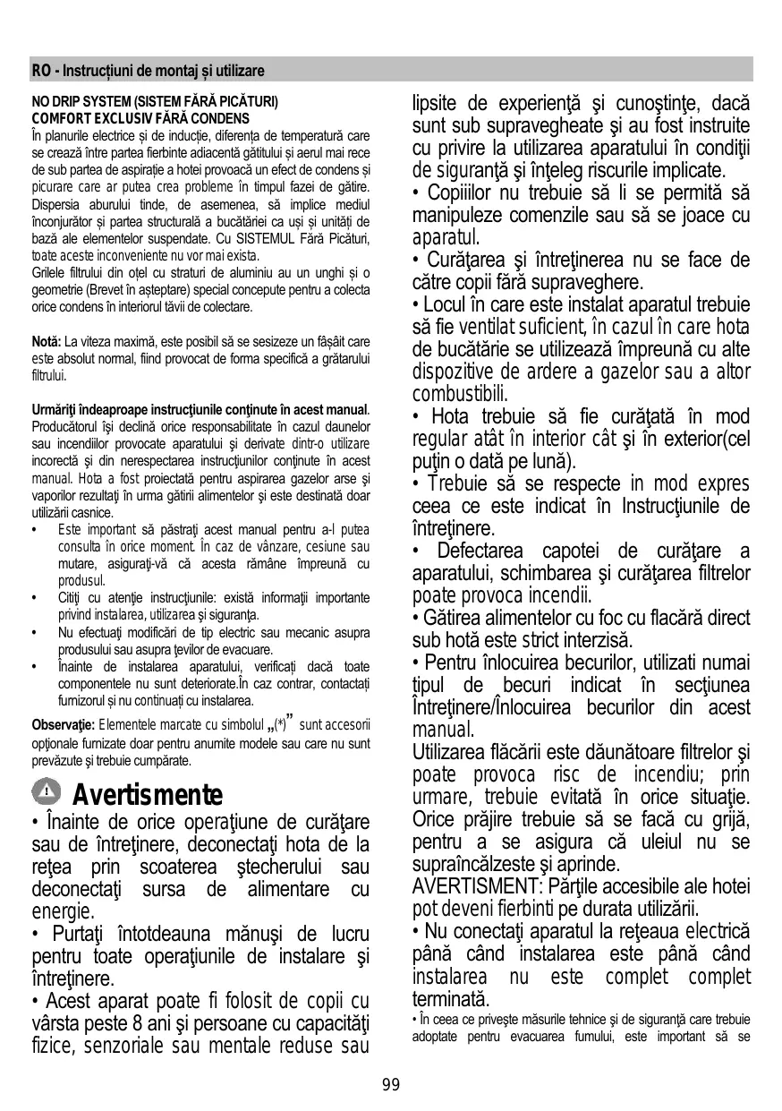 NO DRIP SYSTEM (SISTEM FĂRĂ PICĂTURI) COMFORT EXCLUSIV FĂRĂ CONDENS În planurile electrice și de inducție, diferența de temperatură care se crează între partea fierbinte adiacentă gătitului și aerul mai rece de sub partea de aspirație a hotei provoacă un efect de condens și picurare care ar putea crea probleme în timpul fazei de gătire. Dispersia aburului tinde, de asemenea, să implice mediul înconjurător și partea structurală a bucătăriei ca uși și unități de bază ale elementelor suspendate. Cu SISTEMUL Fără Picături, toate aceste inconveniente nu vor mai exista. Grilele filtrului din oțel cu straturi de aluminiu au un unghi și o geometrie (Brevet în așteptare) special concepute pentru a colecta orice condens în interiorul tăvii de colectare. Notă: La viteza maximă, este posibil să se sesizeze un fâșâit care este absolut normal, fiind provocat de forma specifică a grătarului filtrului. Urmăriţi îndeaproape instrucţiunile conţinute în acest manual. Producătorul îşi declină orice responsabilitate în cazul daunelor sau incendiilor provocate aparatului şi derivate dintr-o utilizare incorectă şi din nerespectarea instrucţiunilor conţinute în acest manual. Hota a fost proiectată pentru aspirarea gazelor arse şi vaporilor rezultaţi în urma gătirii alimentelor şi este destinată doar utilizării casnice. • Este important să păstraţi acest manual pentru a-l putea consulta în orice moment. În caz de vânzare, cesiune sau mutare, asiguraţi-vă că acesta rămâne împreună cu produsul. • Citiţi cu atenţie instrucţiunile: există informaţii importante privind instalarea, utilizarea şi siguranţa. • Nu efectuaţi modificări de tip electric sau mecanic asupra produsului sau asupra ţevilor de evacuare. • Înainte de instalarea aparatului, verificați dacă toate componentele nu sunt deteriorate.În caz contrar, contactați furnizorul și nu continuați cu instalarea. Observaţie: Elementele marcate cu simbolul „(*)” sunt accesorii opţionale furnizate doar pentru anumite modele sau care nu sunt prevăzute şi trebuie cumpărate.