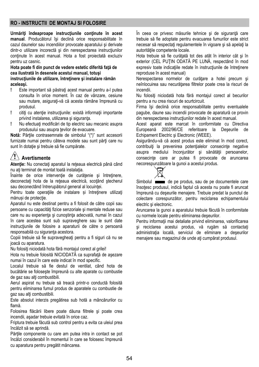 Les pièces accessibles peuvent se réchauffer de façon importante quand elles sont utilisées avec des appareils pour la cuisson. En ce qui concerne les mesures techniques et de sécurité à adopter pour l’évacuation des fumées, s’en tenir strictement à ce qui est prévu dans les règlements des autorités locales compétentes. La hotte doit être régulièrement nettoyée, aussi bien à l’intérieur qu’à l’extérieur (AU MOINS UNE FOIS PAR MOIS, respecter néanmoins les instructions relatives à l’entretien fournies dans ce manuel). La non observation de ces normes de nettoyage de la hotte et du changement et nettoyage des filtres comporte des risques d’incendie. Ne pas utiliser ou laisser la hotte sans que les ampoules soient correctement placées pour éviter tout risque de choc électrique. La société décline toute responsabilité pour d’éventuels inconvénients, dégâts ou incendies provoqués par l’appareil et dérivés de la non observation des instructions reprises dans ce manuel. Cet appareil porte le symbole du recyclage conformément à la Directive Européenne 2002/96/CE concernant les Déchets d’Équipements Électriques et Électroniques (DEEE ou WEEE). En procédant correctement à la mise au rebut de cet appareil, vous contribuerez à empêcher toute conséquence nuisible pour l’environnement et la santé de l’homme.