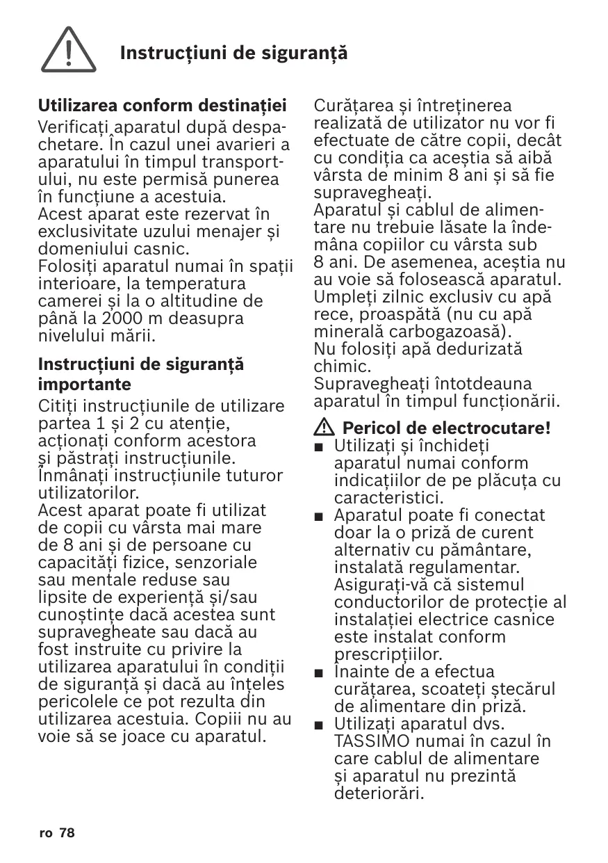 Curăţarea și întreţinerea realizată de utilizator nu vor fi efectuate de către copii, decât cu condiţia ca aceștia să aibă vârsta de minim 8 ani și să fie supravegheaţi. Aparatul și cablul de alimen tare nu trebuie lăsate la înde mâna copiilor cu vârsta sub 8 ani. De asemenea, aceștia nu au voie să folosească aparatul. Umpleţi zilnic exclusiv cu apă rece, proaspătă (nu cu apă minerală carbogazoasă). Nu folosiţi apă dedurizată chimic. Supravegheaţi întotdeauna aparatul în timpul funcţionării. W Pericol de electrocutare! ■ Utilizaţi și închideţi aparatul numai conform indicaţiilor de pe plăcuţa cu caracteristici. ■ Aparatul poate fi conectat doar la o priză de curent alternativ cu pământare, instalată regulamentar. Asiguraţivă că sistemul conductorilor de protecţie al instalaţiei electrice casnice este instalat conform prescripţiilor. ■ Înainte de a efectua curăţarea, scoateţi ștecărul de alimentare din priză. ■ Utilizaţi aparatul dvs. TASSIMO numai în cazul în care cablul de alimentare și aparatul nu prezintă deteriorări.