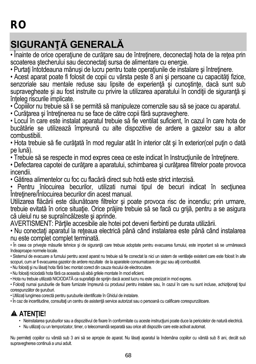ATENȚIE: aparatul nu este destinat punerii în funcțiune prin intermediul unui dispozitiv extern sau al unui sistem separat de comandă de la distanță. Acest aparat nu este destinat uzului profesional. Nu utilizați aparatul în aer liber. Pentru a evita pericolul de accidentare, aparatul trebuie să fie manevrat și instalat de două sau mai multe persoane. Operațiunile de instalare, inclusiv eventualele racordări la linia de alimentare cu apă (dacă sunt prevăzute) și legăturile electrice, precum și lucrările de reparație trebuie să fie efectuate de personal calificat. După terminarea operațiunilor de instalare, nu lăsați materialele folosite pentru ambalare (bucăți din plastic, polistiren etc.) la îndemâna copiilor, pentru a evita pericolul de sufocare. . Nu folosiți aparatul dacă aveți părți ale corpului umede sau dacă sunteți desculți. Nu folosiți niciodată aparate de curățat cu aburi - pericol de electrocutare. Materialele folosite pentru ambalare sunt 100% reciclabile și sunt marcate cu simbolul de reciclare Hota poate fi din punct de vedere estetic diferită faţă de cea ilustrată în desenele acestui manual, totuşi instrucţiunile de utilizare, întreţinere şi instalare rămân aceleaşi. Urmăriţi îndeaproape instrucţiunile conţinute în acest manual. Producătorul îşi declină orice responsabilitate în cazul daunelor sau incendiilor provocate aparatului şi derivate dintr-o utilizare incorectă şi din nerespectarea instrucţiunilor conţinute în acest manual. Hota a fost proiectată pentru aspirarea gazelor arse şi vaporilor rezultaţi în urma gătirii alimentelor şi este destinată doar utilizării casnice.