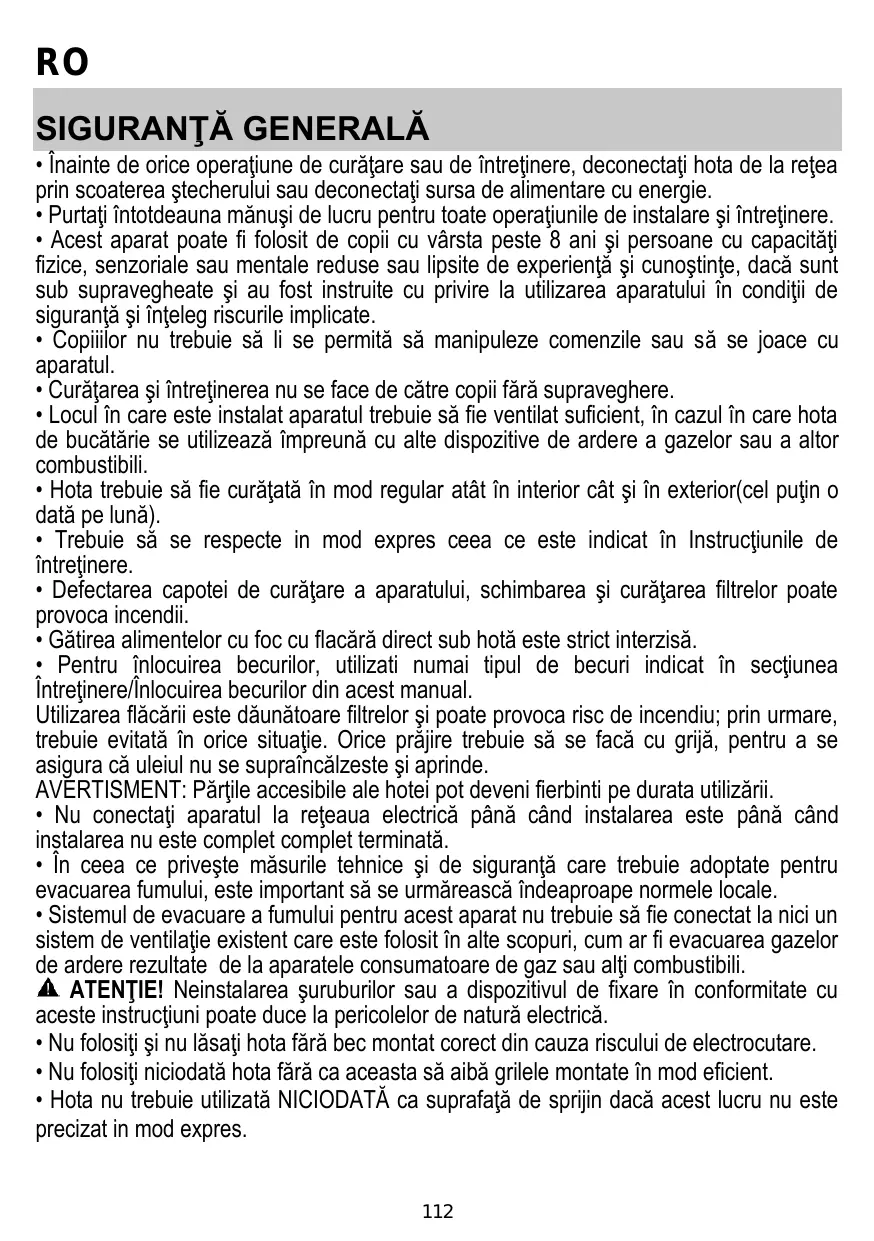 • Les enfants ne doivent pas jouer avec l’appareil. • Le nettoyage et l’entretien par l’usager ne doivent pas être effectués par des enfants sans surveillance. • La pièce doit avoir une aération suffisante lorsque la hotte est utilisée conjointement avec d'autres appareils fonctionnant au gaz ou autres combustibles. • La hotte doit être régulièrement nettoyée à la fois à l'intérieur et à l'extérieur (AU MOINS UNE FOIS PAR MOIS); cela devrait se faire en conformité avec les instructions d'entretien. Le non respect des instructions expressément fournies concernant le nettoyage de la hotte et des filtres peut provoquer des risques d'incendie. • Ne pas flamber d’aliments sous la hotte. • Pour le remplacement de la lampe, utilisez uniquement le type de lampe spécifié dans la section remplacement/maintenance lampe dans ce manuel. L'utilisation d'une flamme nue est dommageable pour les filtres et peut causer un incendie, par conséquent, il est déconseillé de l'utiliser. La friture doit être faite avec soin afin de s’assurer que l’huile surchauffée ne prenne pas feu. AVERTISSEMENT: Lorsque la table de cuisson est en fonctionnement, les parties accessibles de la hotte peuvent devenir très chaudes. • Ne pas brancher l'appareil au réseau électrique avant que l'installation ne soit complètement terminée. • En ce qui concerne les mesures techniques et de sécurité à prendre pour l'évacuation des fumées, respectez strictement les dispositions des règlements locales. • L’air ne doit pas être envoyé dans un conduit utilisé pour évacuer les fumées d’appareils utilisant du gaz ou un autre combustible. ATTENTION ! Le défaut d'installer les vis et les dispositifs de fixation conformément à ces instructions peut entraîner des risques électriques. • Ne pas utiliser ou laisser la hotte sans les lampes correctement montées, car un éventuel risque de choc électrique est possible. • N’utilisez jamais la hotte sans la grille montée correctement! • La hotte ne doit JAMAIS être utilisée comme une surface d'appui, sauf indication expresse. 21