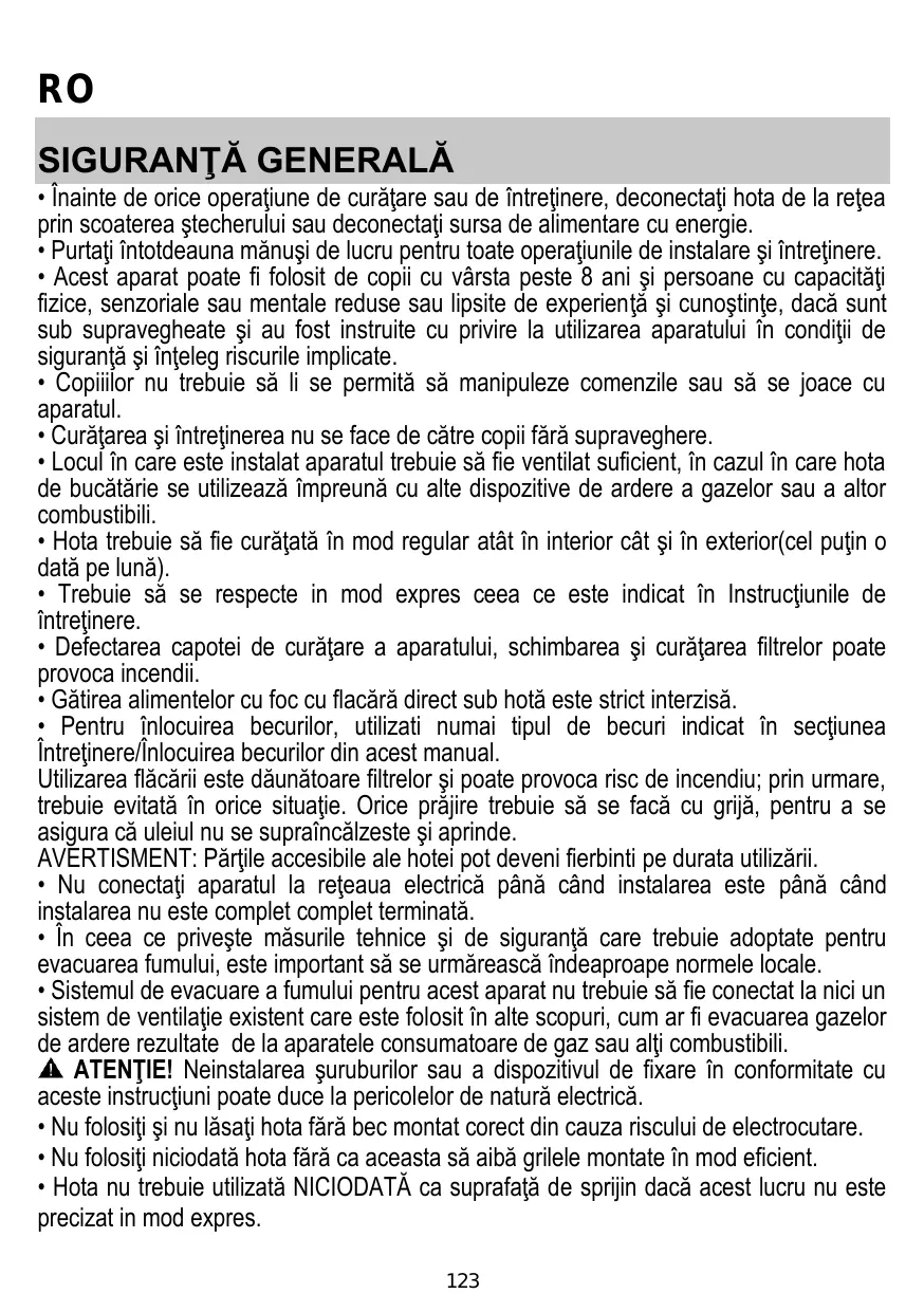 RO SIGURANŢĂ GENERALĂ • Înainte de orice operaţiune de curăţare sau de întreţinere, deconectaţi hota de la reţea prin scoaterea ştecherului sau deconectaţi sursa de alimentare cu energie. • Purtaţi întotdeauna mănuşi de lucru pentru toate operaţiunile de instalare şi întreţinere. • Acest aparat poate fi folosit de copii cu vârsta peste 8 ani şi persoane cu capacităţi fizice, senzoriale sau mentale reduse sau lipsite de experienţă şi cunoştinţe, dacă sunt sub supravegheate şi au fost instruite cu privire la utilizarea aparatului în condiţii de siguranţă şi înţeleg riscurile implicate. • Copiiilor nu trebuie să li se permită să manipuleze comenzile sau să se joace cu aparatul. • Curăţarea şi întreţinerea nu se face de către copii fără supraveghere. • Locul în care este instalat aparatul trebuie să fie ventilat suficient, în cazul în care hota de bucătărie se utilizează împreună cu alte dispozitive de ardere a gazelor sau a altor combustibili. • Hota trebuie să fie curăţată în mod regular atât în interior cât şi în exterior(cel puţin o dată pe lună). • Trebuie să se respecte in mod expres ceea ce este indicat în Instrucţiunile de întreţinere. • Defectarea capotei de curăţare a aparatului, schimbarea şi curăţarea filtrelor poate provoca incendii. • Gătirea alimentelor cu foc cu flacără direct sub hotă este strict interzisă. • Pentru înlocuirea becurilor, utilizati numai tipul de becuri indicat în secţiunea Întreţinere/Înlocuirea becurilor din acest manual. Utilizarea flăcării este dăunătoare filtrelor şi poate provoca risc de incendiu; prin urmare, trebuie evitată în orice situaţie. Orice prăjire trebuie să se facă cu grijă, pentru a se asigura că uleiul nu se supraîncălzeste şi aprinde. AVERTISMENT: Părţile accesibile ale hotei pot deveni fierbinti pe durata utilizării. • Nu conectaţi aparatul la reţeaua electrică până când instalarea este până când instalarea nu este complet complet terminată. • În ceea ce priveşte măsurile tehnice şi de siguranţă care trebuie adoptate pentru evacuarea fumului, este important să se urmărească îndeaproape normele locale. • Sistemul de evacuare a fumului pentru acest aparat nu trebuie să fie conectat la nici un sistem de ventilaţie existent care este folosit în alte scopuri, cum ar fi evacuarea gazelor de ardere rezultate de la aparatele consumatoare de gaz sau alţi combustibili. ATENŢIE! Neinstalarea şuruburilor sau a dispozitivul de fixare în conformitate cu aceste instrucţiuni poate duce la pericolelor de natură electrică. • Nu folosiţi şi nu lăsaţi hota fără bec montat corect din cauza riscului de electrocutare. • Nu folosiţi niciodată hota fără ca aceasta să aibă grilele montate în mod eficient. • Hota nu trebuie utilizată NICIODATĂ ca suprafaţă de sprijin dacă acest lucru nu este precizat in mod expres. 123