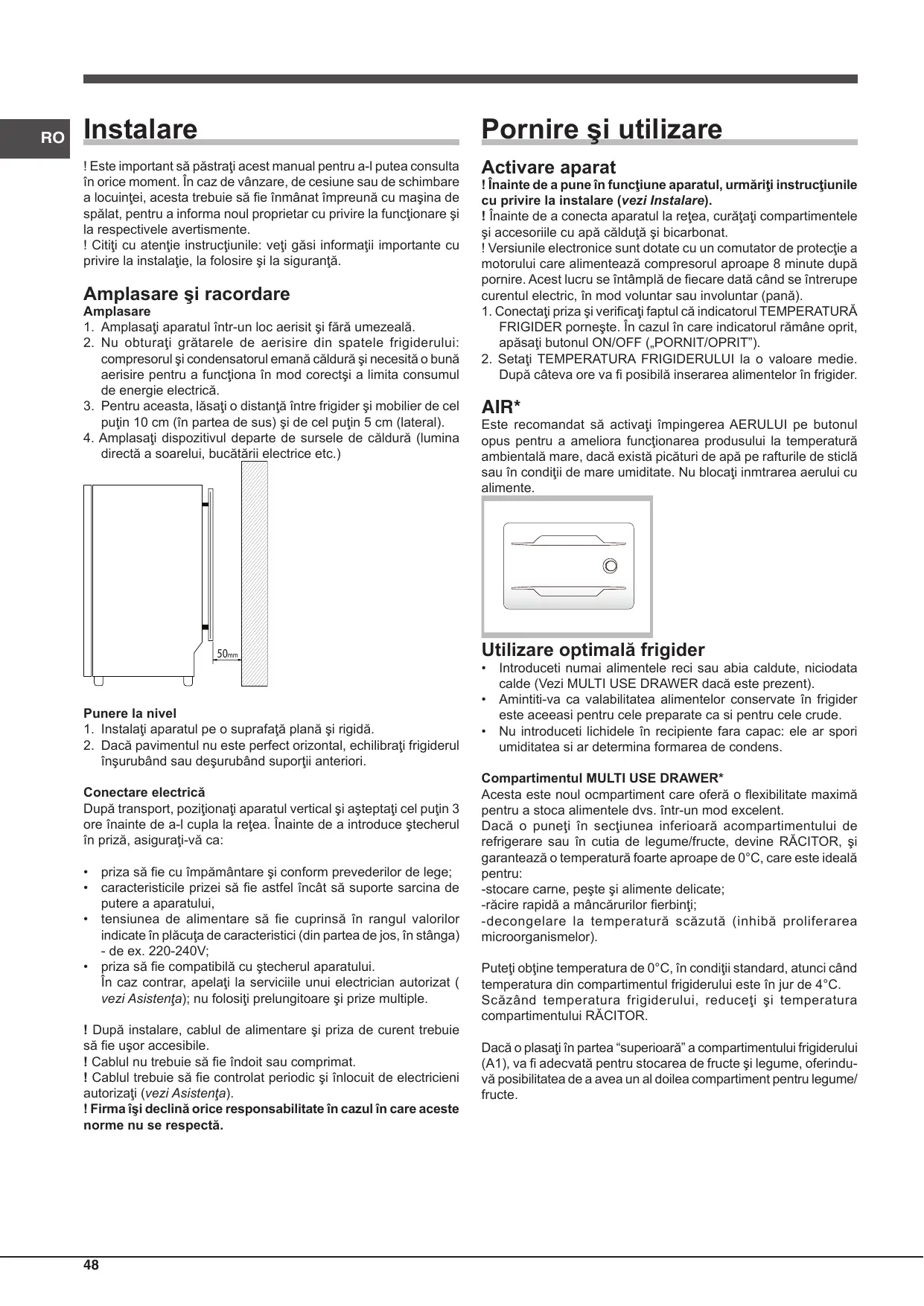 Il est recommandé d’activer l’arrivée d’air sur le bouton approprié pour améliorer le fonctionnement de l’appareil par température ambiante élevée, en présence de gouttes d’eau sur les rayons en verre ou en cas d’humidité élevée. N’obstruez pas l’admission d’air avec les aliments.