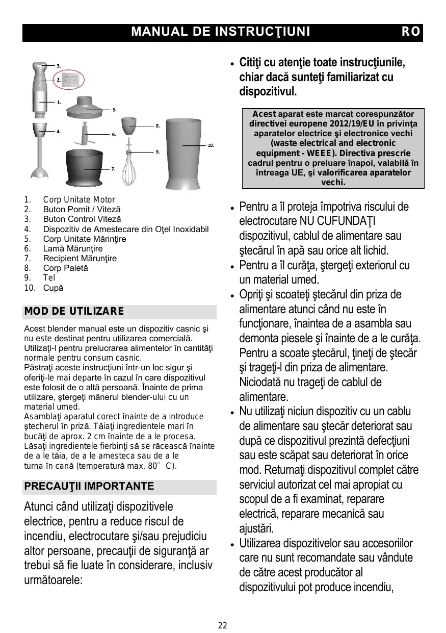 Électrique et Électronique (DEEE). Cette directive sert de règlement cadre à la reprise, au recyclage et à la valorisation des appareils ménagers usagés dans toute l’Union européenne. • 1. 2. Couteau du hachoir Bol hachoir Corps du batteur Fouetter Bécher Avant la première utilisation, essuyez la poignée du mixeur avec un linge humide. Assemblez l'appareil correctement avant de le brancher à une prise secteur. Avant de les passer au mixeur ou de les verser dans le bol, coupez les gros ingrédients en morceaux de 2 cm environ et laissez-les refroidir s'ils sont chauds (température max 80°C).