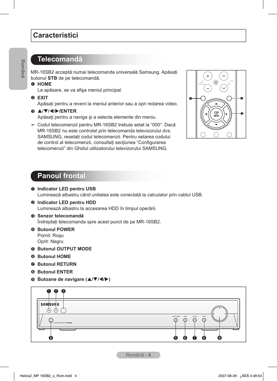 Telecomandă MR-16SB2 acceptă numai telecomanda universală Samsung. Apăsaţi butonul STB de pe telecomandă. HOME La apăsare, se va afişa meniul principal. EXIT Apăsaţi pentru a reveni la meniul anterior sau a opri redarea video. ////ENTER Apăsaţi pentru a naviga şi a selecta elemente din meniu. ➢ Codul telecomenzii pentru MR-16SB2 trebuie setat la “000”. Dacă MR-16SB2 nu este controlat prin telecomanda televizorului dvs. SAMSUNG, resetaţi codul telecomenzii. Pentru setarea codului de control al telecomenzii, consultaţi secţiunea “Configurarea telecomenzii” din Ghidul utilizatorului televizorului SAMSUNG.
