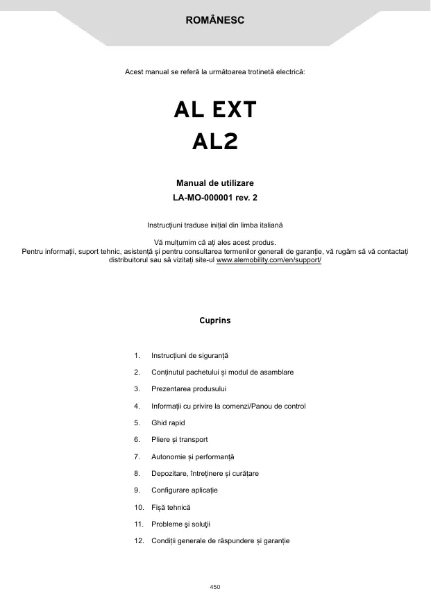 N'utilisez pas d'accessoires et / ou de pièces supplémentaires non approuvés par le fabricant. Tenez les enfants à l'écart des pièces en plastique (y compris les matériaux d'emballage) et des petites pièces qui peuvent provoquer une suffocation. Il est interdit de modifier ou de transformer le produit ou ses parties de quelque manière que ce soit, car cela pourrait nuire à l'efficacité, à la structure et causer des dommages. Si vous détectez des défauts d'usine, des bruits inhabituels ou des anomalies, ne conduisez pas le véhicule et contactez votre concessionnaire ou visitez le site www.alemobility.com/en/ pour bénéficier de l’assistance technique.
