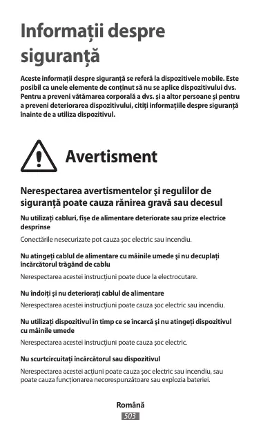 Ne peignez jamais votre appareil et n’y apposez jamais d’autocollants • La peinture et les autocollants risquent de bloquer les pièces mobiles de l’appareil et perturber son fonctionnement. • Si vous êtes allergique à la peinture ou aux pièces métalliques de l’appareil, vous pouvez souffrir de démangeaisons, d’eczéma ou de toute autre réaction cutanée. Si ces symptômes apparaissent, cessez immédiatement d’utiliser l’appareil et consultez un médecin. N’utilisez pas l’appareil si un des éléments est fissuré ou cassé Le verre ou l’acrylique brisé risque de vous blesser à la main ou au visage. Confiez votre appareil à un service après-vente Samsung afin de le faire réparer. Installez l’appareil et ses accessoires avec précaution • Veillez à la bonne fixation de votre appareil mobile et de ses accessoires dans votre véhicule. • Évitez de placer votre appareil ou ses accessoires à proximité de la zone de déploiement des airbags. Si l’équipement mobile n’est pas installé correctement, le déclenchement de l’airbag risque de provoquer des blessures graves. Ne laissez pas tomber votre appareil et ne l’exposez pas aux chocs • L’appareil peut être endommagé ou subir des dysfonctionnements. • Votre appareil peut être endommagé ou certaines pièces peuvent subir des dysfonctionnements si vous le tordez ou le déformez. Préservez la durée de vie de la batterie et du chargeur • Évitez de laisser l’appareil en charge pendant plus d’une semaine, car une surcharge risque de réduire la durée de vie de la batterie. • Lorsqu’il n’est pas utilisé pendant une durée prolongée, votre appareil se décharge progressivement et devra être rechargé avant toute utilisation. • Débranchez le chargeur de la prise secteur lorsque vous ne l’utilisez pas. • Utilisez uniquement la batterie dans le cadre de l’utilisation prévue.