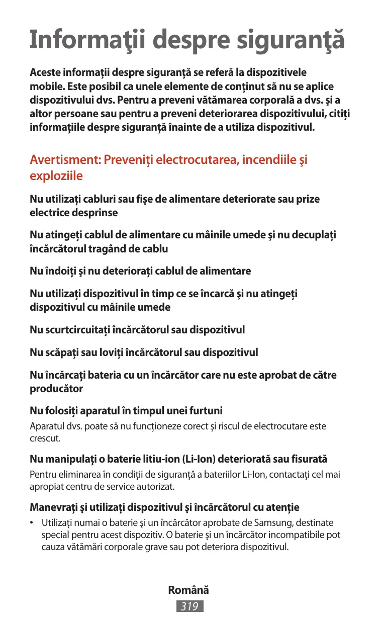 Nu muşcaţi şi nu ţineţi în gură dispozitivul sau bateria • Puteţi deteriora dispozitivul sau puteţi provoca explozii. • Dacă dispozitivul este utilizat de către copii, asiguraţi-vă că îl utilizează în mod corespunzător.