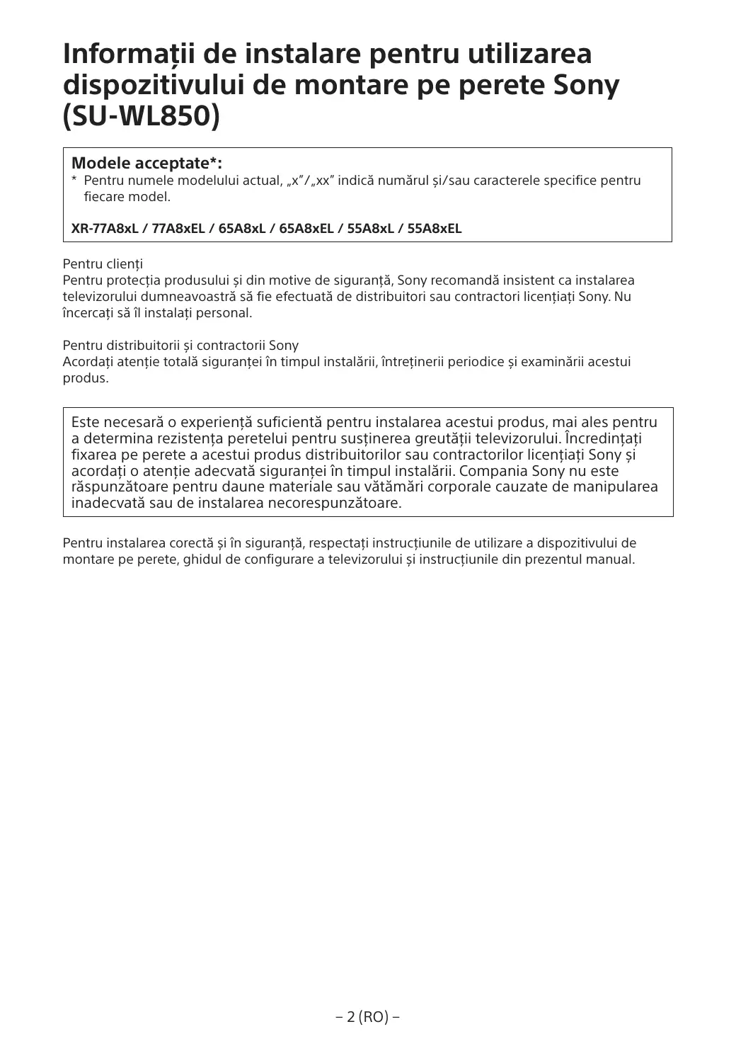N’essayez pas de l’installer vous-même. A l’attention des revendeurs et installateurs Sony Soyez particulièrement attentif à la sécurité pendant l’installation, l’entretien périodique et l’examen du produit.