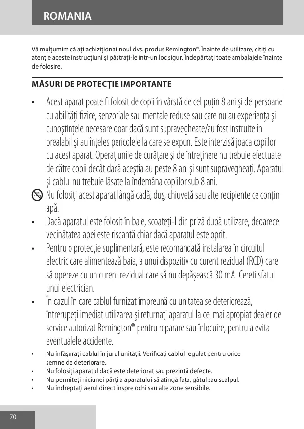 • Lorsque l’appareil est utilisé dans une salle de bains, débranchez-le après usage. La proximité de l’eau présente un danger même lorsque l’appareil est éteint. • Pour une protection supplémentaire, l’installation de courant résiduel (RCD) avec un differentiel residuel nominal ne dépassant pas 30mA est recommandée. Demandez de l’aide à un électricien. • Si le cordon d’alimentation de cet appareil est endommagé, cessez immédiatement d’utiliser l’appareil et renvoyez-le au service consommateurs Remington agréé le plus proche en vue de sa réparation ou de sa substitution afin d’éviter tout risque.