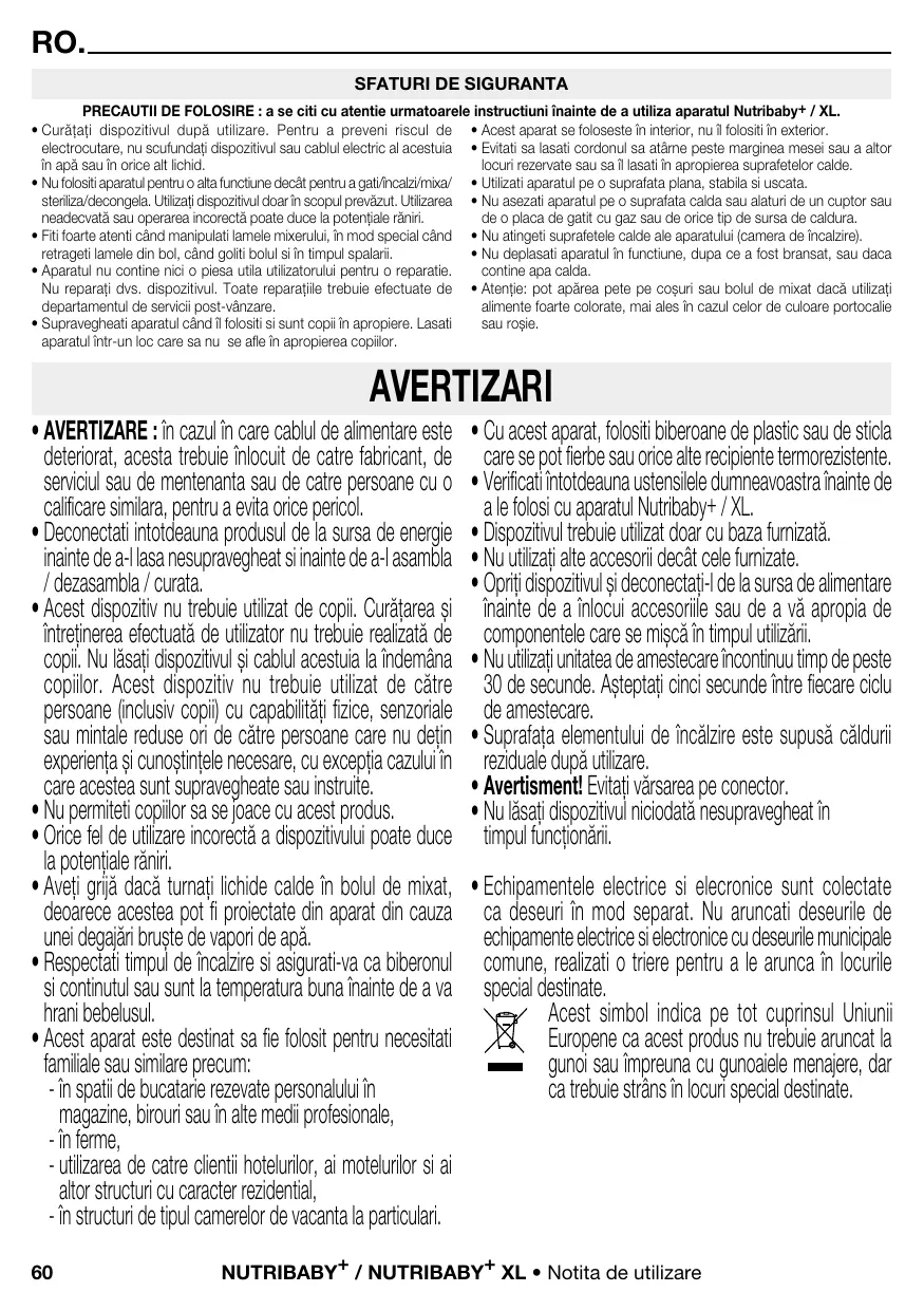 - d es environnements du type de chambres d’hôtes. • Utilisez des biberons en plastique ou en verre pouvant bouillir ou tous autres récipients thermorésistants avec cet appareil. • Vérifiez toujours vos ustensiles avant de les employer avec le Nutribaby+ / XL. • L 'appareil doit seulement être utilisé avec la base fournie. • N e pas utiliser d'accessoires autres que ceux fournis. • Éteignez l'appareil et déconnectez le câble avant de changer des accessoires ou d'approcher des pièces en mouvement pendant l'utilisation. • Ne faites pas fonctionner l'unité de mixage en continu pendant plus de 30 secondes. Attendez cinq secondes entre chaque cycle de mixage. • La surface de l'élément chauffant est soumise à la chaleur résiduelle après utilisation. • A vertissement! Évitez les déversements sur le connecteur. • Ne laissez jamais l'appareil sans surveillance pendant son fonctionnement. • Les équipements électriques et électroniques font l’objet d’une collecte sélective. Ne pas se débarrasser des déchets d’équipements électriques et électroniques avec les déchets municipaux non triés, mais procéder à leur collecte sélective. Ce symbole indique à travers l’Union Européenne que ce produit ne doit pas être jeté à la poubelle ou mélangé aux ordures ménagères, mais faire l’objet d’une collecte sélective.