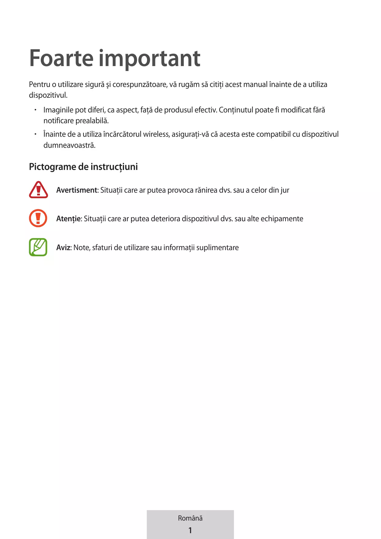Foarte important Pentru o utilizare sigură şi corespunzătoare, vă rugăm să citiți acest manual înainte de a utiliza dispozitivul. • Imaginile pot diferi, ca aspect, faţă de produsul efectiv. Conţinutul poate fi modificat fără notificare prealabilă. • Înainte de a utiliza încărcătorul wireless, asigurați-vă că acesta este compatibil cu dispozitivul dumneavoastră.