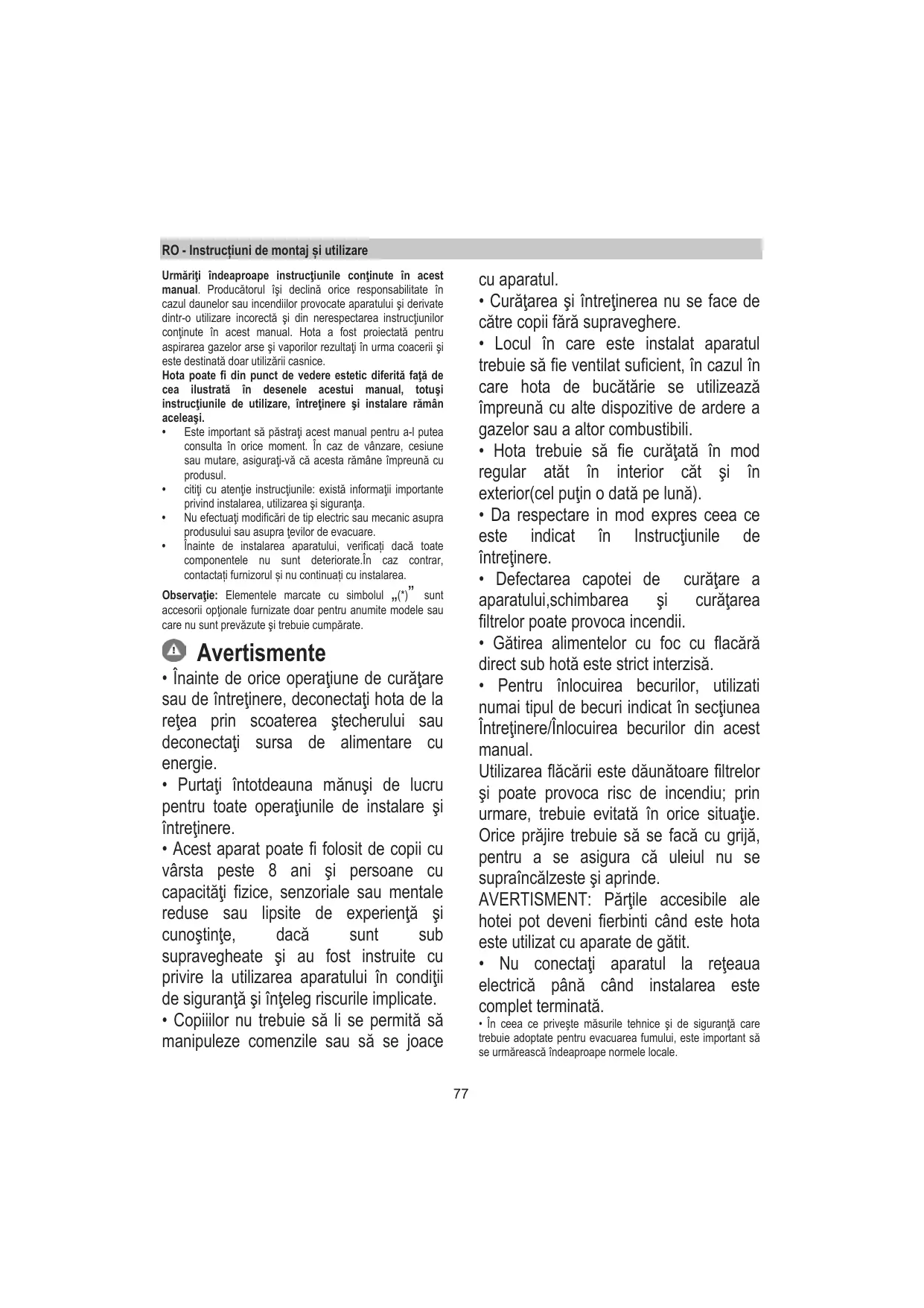 MANUAL DE UTILIZARE HOTTEADELEBLMAT/A/90i ELICA