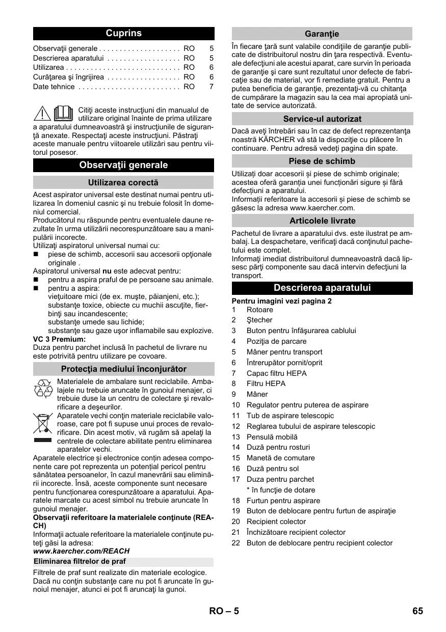 VCS - Aspirator cu rezervor KARCHER - Notice d'utilisation et mode d'emploi gratuit