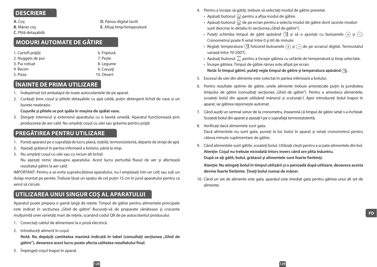 MODE D’EMPLOI DE L’APPAREIL L’appareil permet de cuire une vaste gamme de recettes. Les temps de cuisson pour les principaux ingrédients sont indiqués dans la section « Réglages ». Savourez des plats sains et croustillants grâce à notre grande variété de recettes en flashant le code QR sur le sticker du produit.