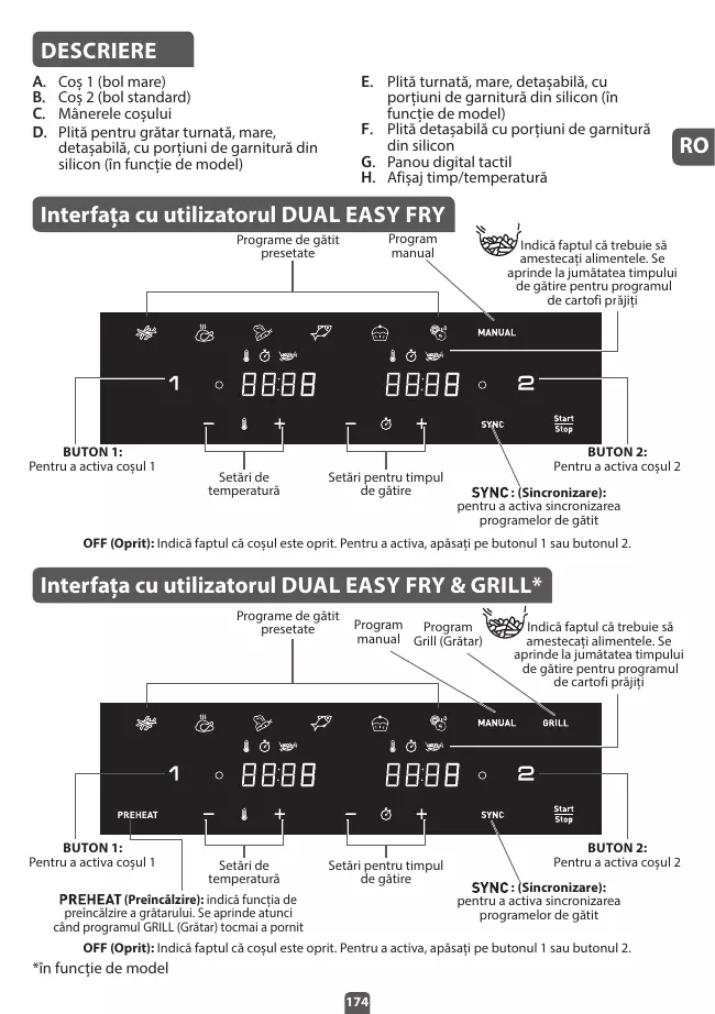 La fonction gril s’utilise uniquement pour la cuve n°1. 1. Placez toujours la plaque gril dans la cuve n° 1 de l’appareil. 2. Appuyez sur . Le mode Frites s’affiche par défaut à l’écran pour la cuve n°1 tandis que OFF s’affiche sur l’écran de la cuve n°2. 3. Appuyez sur la touche de l’écran pour sélectionner le programme Grill et ajustez le temps de cuisson si nécessaire. La température est automatiquement réglée à 200°C. Ne placez pas les aliments dans la cuve n° 1, une phase de préchauffage du gril sera lancée automatiquement. 4. Appuyez sur ‘2’ pour activer la cuve n°2 et sélectionnez le mode de cuisson souhaité (exemple : frites) et ajustez le temps et la température si nécessaire. 5. Ajoutez vos aliments dans La cuve n°2. Remettez la cuve dans l’appareil. 6. Appuyez sur . 7. Démarrez la cuisson en appuyant sur . Ceci lancera la phase de préchauffage du gril (cuve n° 1). s’allume et l’écran affiche “Pre Heat”. La température du gril est automatiquement réglée à 200°C. 8. Lorsque vous entendez la minuterie, la phase de préchauffage est terminée. L’écran affiche ‘Add’. 9. Retirez la cuve n°1 de l’appareil et posez-la sur une surface résistante à la chaleur. Attention: La cuve et la grille sont chaudes. Utilisez une pince pour mettre les ingrédients sur la grille. Note : Lorsque l’écran affiche ‘Add’ et s’il n’y a aucune action pendant 10 minutes, le programme s’arrête et l’écran affiche à nouveau “START/STOP”. Vous devrez resélectionner pour recommencer la cuisson. 10. Ajoutez les ingrédients dans la cuve et remettez-la dans l’appareil. 11. La cuisson commence automatiquement. Le temps de cuisson restant s’affiche sur l’écran. Remarque : il est nécessaire de retourner les pièces de viande à mi-cuisson. L’excès d’huile des ingrédients est collecté au fond de la cuve. 12. Lorsque le temps de cuisson est écoulé, l’appareil sonne et s’arrête. Retirez la cuve de l’appareil et posez-la sur une surface résistante à la chaleur. 13. Utilisez une pince pour retirer les ingrédients. Attention: Après la cuisson à air chaud, la cuve, la grille et les ingrédients sont chauds. Note : Pendant la cuisson, si vous retirez l’une des cuves et que vous ne la remettez pas en place dans les 5 minutes qui suivent, l’écran de cette cuve affichera ‘OFF’. L’autre cuve continue à fonctionner, mais cela met fin au programme ‘SYNC’. *selon modèle 14