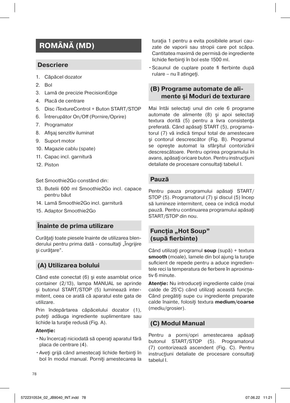 Automatiques et Modes de Texture Tout d‘abord, sélectionnez l’un des six programmes alimentaires automatiques (8) puis sélectionnez la texture (5) de votre choix pour obtenir votre consistance préférée. Après avoir appuyé sur START (5), le minuteur (7) affiche le temps de mixage total et effectue un compte à rebours (Fig. B). Le programme s‘arrête automatiquement à la fin du compte à rebours. Pour arrêter le programme avant la fin, appuyez sur n’importe quel bouton. Pour les instructions de fonctionnement détaillées voir le tableau I.