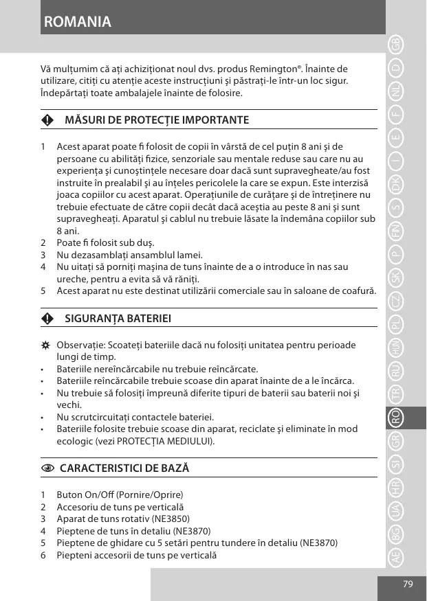 I E F MĂSURI DE PROTECŢIE IMPORTANTE F Vă mulţumim că aţi achiziţionat noul dvs. produs Remington®. Înainte de utilizare, citiţi cu atenţie aceste instrucţiuni şi păstraţi-le într-un loc sigur. Îndepărtaţi toate ambalajele înainte de folosire.