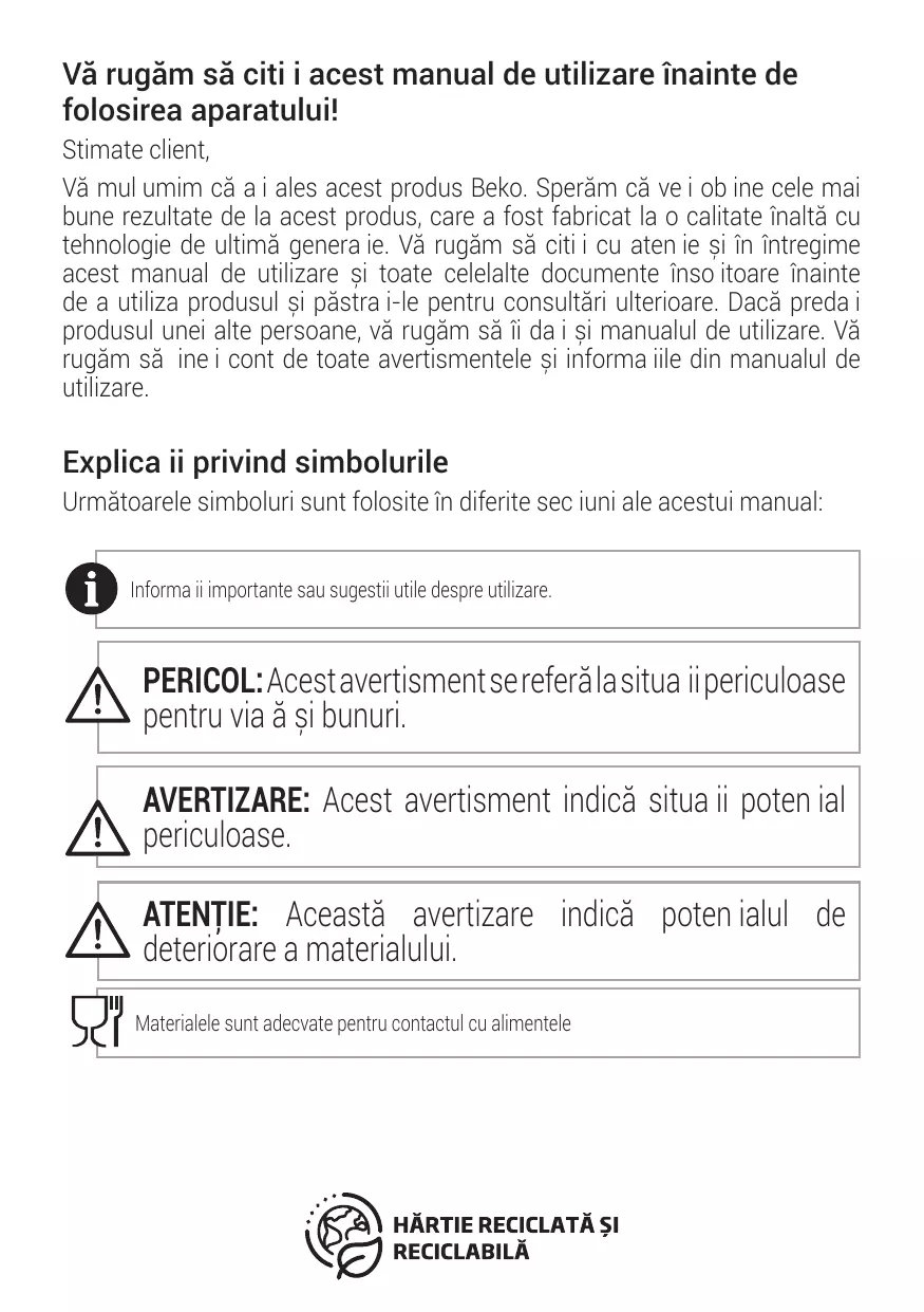 La machine à café expresso manuelle Beko est destinée à être utilisée à domicile et dans des applications similaires, par exemple dans les cuisines du personnel, les magasins, les bureaux et autres lieux similaires ou par les clients des chambres d’hôtes, des hôtels, des motels et autres lieux d'habitation. Cette machine à café n'est pas destinée à un usage commercial. La machine est uniquement destinée à la préparation du café et au chauffage du lait et de l'eau. Toute autre utilisation que celle indiquée précédemment est considérée comme une utilisation abusive. onsignes importantes sur la sécurité et 1 C l'environnement