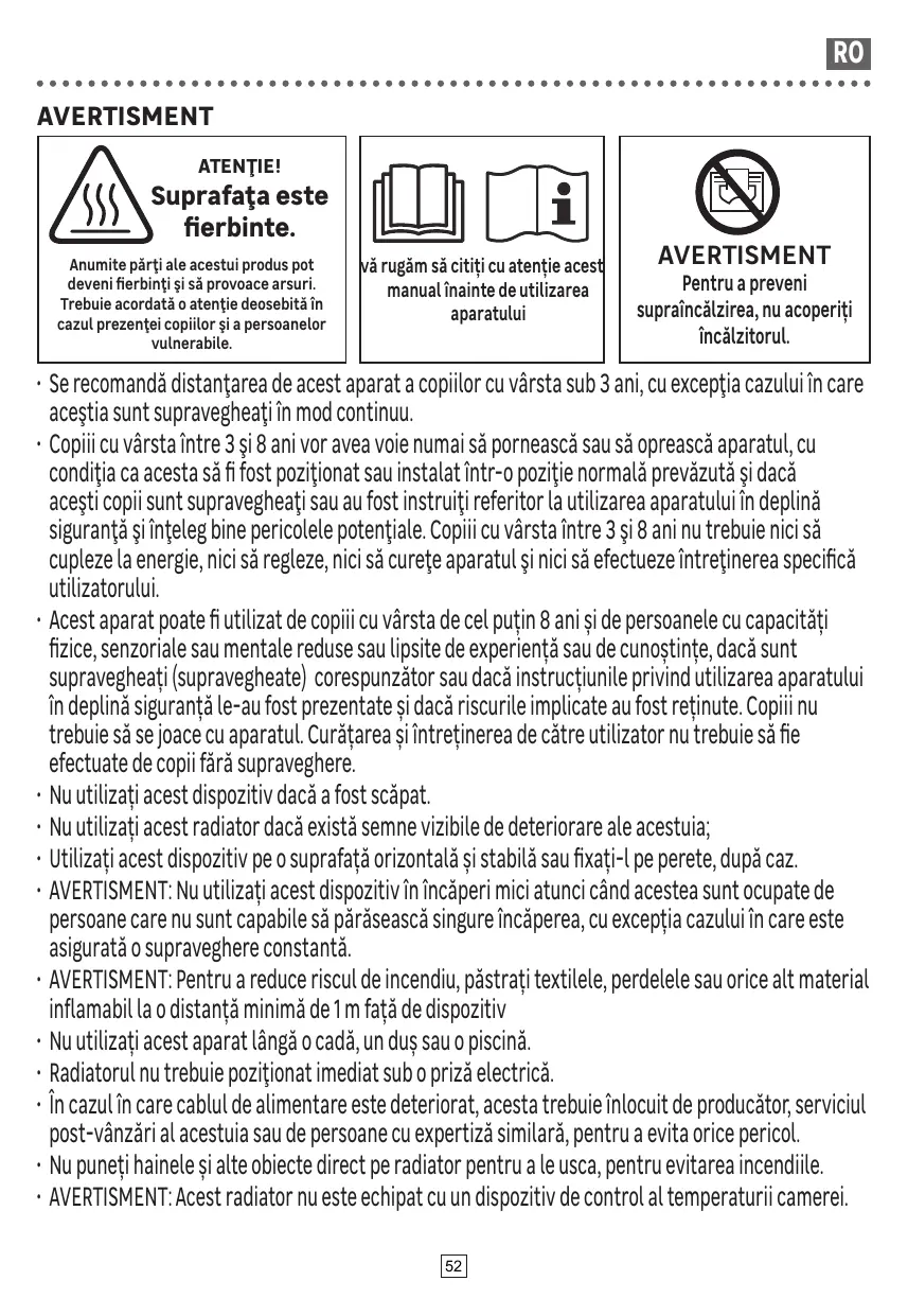 • Les enfants âgés entre 3 ans et 8 ans doivent uniquement mettre l'appareil en marche ou à l'arrêt, à condition que ce dernier ait été placé ou installé dans une position normale prévue et que ces enfants disposent d'une surveillance ou aient reçu des instructions quant à l'utilisation de l'appareil en toute sécurité et en comprennent bien les dangers potentiels. Les enfants âgés entre 3 ans et 8 ans ne doivent ni brancher, ni régler, ni nettoyer l'appareil, et ni réaliser l'entretien de l'utilisateur. • Cet appareil peut être utilisé par des enfants âgés d'au moins 8 ans et par des personnes ayant des capacités physiques, sensorielles ou mentales réduites ou dénuées d’expérience ou de connaissance, s'ils (si elles) sont correctement surveillé(e)s ou si des instructions relatives à l'utilisation de l'appareil en toute sécurité leur ont été données et si les risques encourus ont été appréhendés. Les enfants ne doivent pas jouer avec l’appareil. Le nettoyage et l'entretien par l'usager ne doivent pas être effectués par des enfants sans surveillance. • Ne pas utiliser cet appareil s'il est tombé • Ne pas utiliser l’appareil de chauffage si il présente des signes visibles de dommage; • Utiliser cet appareil sur une surface horizontale et stable, ou le fixer au mur, selon le cas. • AVERTISSEMENT: Ne pas utiliser cet appareil dans de petites pièces lorsqu'elles sont occupées par des personnes incapables de quitter la pièce par elles-mêmes, sauf si une surveillance constante est assurée. • AVERTISSEMENT: Pour réduire le risque d'incendie, garder les textiles, les rideaux ou tout autre matériau inflammable à une distance minimale de 1 m de l'appareil. • Ne pas utiliser cet appareil à proximité d'une baignoire, d'une douche, ou d'une piscine. • Le radiateur ne doit pas être situé immédiatement sous une prise de courant • Si le câble d’alimentation est endommagé, il doit être remplacé par le fabricant, son service aprèsvente ou des personnes de qualification similaire afin d’éviter un danger. • Ne mettez pas directement les vêtements et autres articles sur l'appareil pour les réchauffer afin d'éviter un incendie. 33