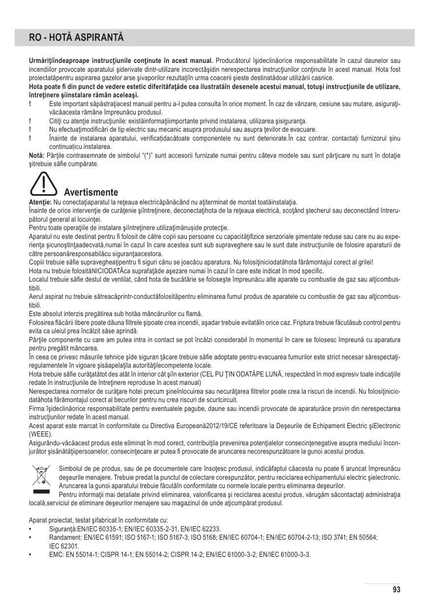 Les enfants doivent être surveillés afin qu’ils ne jouent pas avec l’appareil. Ne jamais utiliser la hotte sans que la grille ne soit montée correctement! La hotte ne doit JAMAIS être utilisée comme plan pour déposer quelque chose sauf si cela est expressément indiqué. Quand la hotte est utilisée en même temps que d’autres appareils à combustion de gaz ou d’autres combustibles, le local doit disposer d’une ventilation suffisante. L’air aspiré ne doit jamais être envoyé dans un conduit utilisé pour l’évacuation des fumées produites par des appareils à combustion de gaz ou d’autres combustibles. Il est formellement interdit de faire flamber les aliments sous la hotte. L’utilisation de flammes libres peut entraîner des dégâts aux filtres et peut donner lieu à des incendies, il faut donc les éviter à tout prix. La friture d’aliments doit être réalisée sous contrôle pour éviter que l’huile surchauffée ne prenne feu. Les pièces accessibles peuvent se réchauffer de façon importante quand elles sont utilisées avec des appareils pour la cuisson. En ce qui concerne les mesures techniques et de sécurité à adopter pour l’évacuation des fumées, s’en tenir strictement à ce qui est prévu dans les règlements des autorités locales compétentes. La hotte doit être régulièrement nettoyée, aussi bien à l’intérieur qu’à l’extérieur (AU MOINS UNE FOIS PAR MOIS, respecter néanmoins les instructions relatives à l’entretien fournies dans ce manuel). La non observation de ces normes de nettoyage de la hotte et du changement et nettoyage des filtres comporte des risques d’incendie. Ne pas utiliser ou laisser la hotte sans que les ampoules soient correctement placées pour éviter tout risque de choc électrique. La société décline toute responsabilité pour d’éventuels inconvénients, dégâts ou incendies provoqués par l’appareil et dérivés de la non observation des instructions reprises dans ce manuel. Cet appareil porte le symbole du recyclage conformément à la Directive Européenne 2012/19/CE concernant les Déchets d’Équipements Électriques et Électroniques (DEEE ou WEEE). En procédant correctement à la mise au rebut de cet appareil, vous contribuerez à empêcher toute conséquence nuisible pour l’environnement et la santé de l’homme. Le symbole présent sur l’appareil ou sur la documentation qui l’accompagne indique que ce produit ne peut en aucun cas être traité comme déchet ménager. Il doit par conséquent être remis à un centre de collecte des déchets chargé du recyclage des équipements électriques et électroniques. Pour la mise au rebut, respectez les normes relatives à l’élimination des déchets en vigueur dans le pays d’installation. Pour obtenir de plus amples détails au sujet du traitement, de la récupération et du recyclage de cet appareil, veuillez vous adresser au bureau compétent de votre commune, à la société de collecte des déchets ou directement à votre revendeur.