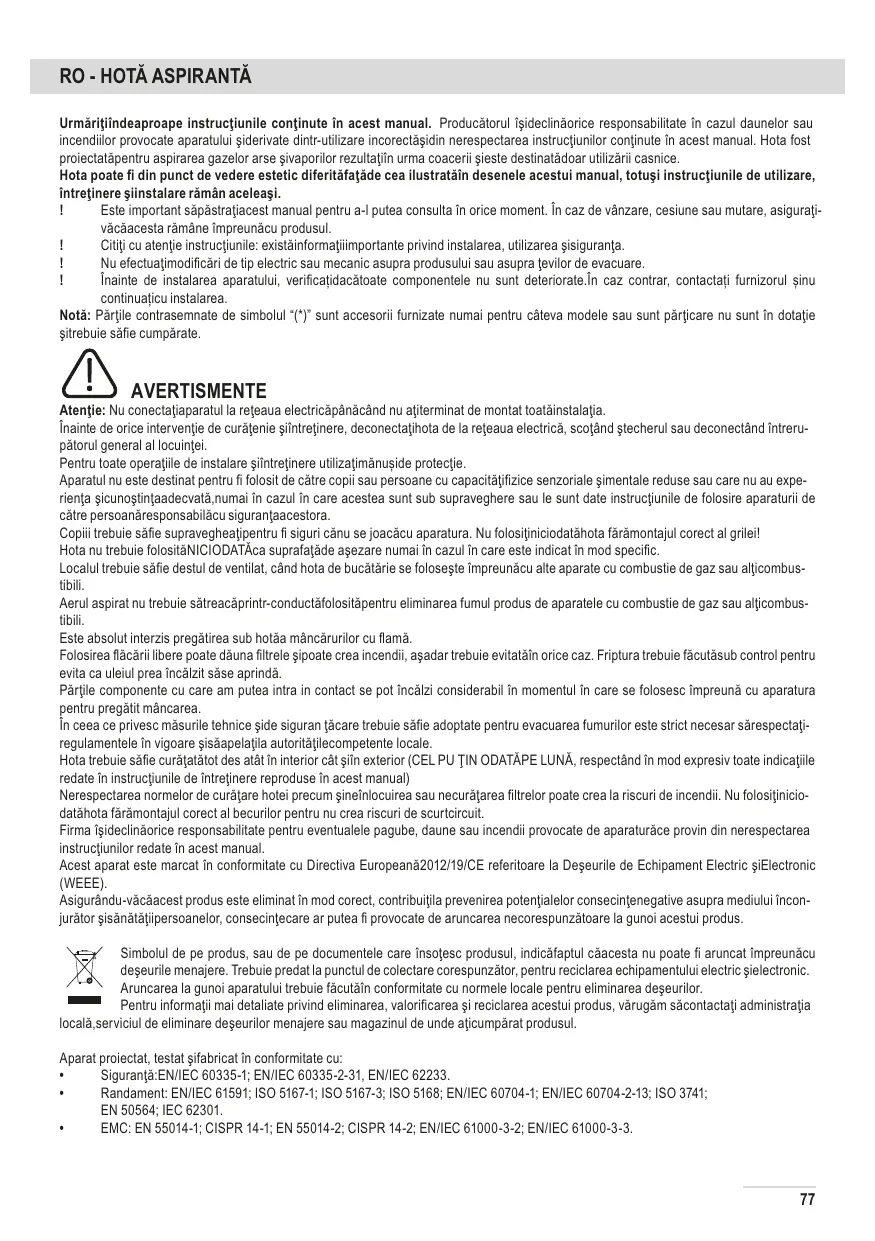 AVERTISMENTE Atenţie: Nu conectaţiaparatul la reţeaua electricăpânăcând nu aţiterminat de montat toatăinstalaţia. Înainte de orice intervenţie de curăţenie şiîntreţinere, deconectaţihota de la reţeaua electrică, scoţând ştecherul sau deconectând întrerupătorul general al locuinţei. Pentru toate operaţiile de instalare şiîntreţinere utilizaţimănușide protecţie. Aparatul nu este destinat pentru fi folosit de către copii sau persoane cu capacităţifizice senzoriale şimentale reduse sau care nu au experienţa şicunoştinţaadecvată,numai în cazul în care acestea sunt sub supraveghere sau le sunt date instrucţiunile de folosire aparaturii de către persoanăresponsabilăcu siguranţaacestora. Copiii trebuie săfie supravegheaţipentru fi siguri cănu se joacăcu aparatura. Nu folosiţiniciodatăhota fărămontajul corect al grilei! Hota nu trebuie folosităNICIODATĂca suprafaţăde aşezare numai în cazul în care este indicat în mod specific. Localul trebuie săfie destul de ventilat, când hota de bucătărie se foloseşte împreunăcu alte aparate cu combustie de gaz sau alţicombustibili. Aerul aspirat nu trebuie sătreacăprintr-conductăfolosităpentru eliminarea fumul produs de aparatele cu combustie de gaz sau alţicombustibili. Este absolut interzis pregătirea sub hotăa mâncărurilor cu flamă. Folosirea flăcării libere poate dăuna filtrele şipoate crea incendii, aşadar trebuie evitatăîn orice caz. Friptura trebuie făcutăsub control pentru evita ca uleiul prea încălzit săse aprindă. Părţile componente cu care am putea intra in contact se pot încălzi considerabil în momentul în care se folosesc împreună cu aparatura pentru pregătit mâncarea. În ceea ce privesc măsurile tehnice şide siguran ţăcare trebuie săfie adoptate pentru evacuarea fumurilor este strict necesar sărespectaţiregulamentele în vigoare şisăapelaţila autorităţilecompetente locale. Hota trebuie săfie curăţatătot des atât în interior cât şiîn exterior (CEL PU ŢIN ODATĂPE LUNĂ, respectând în mod expresiv toate indicaţiile redate în instrucţiunile de întreţinere reproduse în acest manual) Nerespectarea normelor de curăţare hotei precum şineînlocuirea sau necurăţarea filtrelor poate crea la riscuri de incendii. Nu folosiţiniciodatăhota fărămontajul corect al becurilor pentru nu crea riscuri de scurtcircuit. Firma îşideclinăorice responsabilitate pentru eventualele pagube, daune sau incendii provocate de aparaturăce provin din nerespectarea instrucţiunilor redate în acest manual. Acest aparat este marcat în conformitate cu Directiva Europeană2012/19/CE referitoare la Deşeurile de Echipament Electric şiElectronic (WEEE). Asigurându-văcăacest produs este eliminat în mod corect, contribuiţila prevenirea potenţialelor consecinţenegative asupra mediului înconjurător şisănătăţiipersoanelor, consecinţecare ar putea fi provocate de aruncarea necorespunzătoare la gunoi acestui produs. Simbolul de pe produs, sau de pe documentele care însoţesc produsul, indicăfaptul căacesta nu poate fi aruncat împreunăcu deşeurile menajere. Trebuie predat la punctul de colectare corespunzător, pentru reciclarea echipamentului electric şielectronic. Aruncarea la gunoi aparatului trebuie făcutăîn conformitate cu normele locale pentru eliminarea deşeurilor. Pentru informaţii mai detaliate privind eliminarea, valorificarea şi reciclarea acestui produs, vărugăm săcontactaţi administraţia locală,serviciul de eliminare deşeurilor menajere sau magazinul de unde aţicumpărat produsul. Aparat proiectat, testat şifabricat în conformitate cu: • Siguranţă:EN/IEC 60335-1; EN/IEC 60335-2-31, EN/IEC 62233. • Randament: EN/IEC 61591; ISO 5167-1; ISO 5167-3; ISO 5168; EN/IEC 60704-1; EN/IEC 60704-2-13; ISO 3741; EN 50564; IEC 62301. • EMC: EN 55014-1; CISPR 14-1; EN 55014-2; CISPR 14-2; EN/IEC 61000-3-2; EN/IEC 61000-3-3.