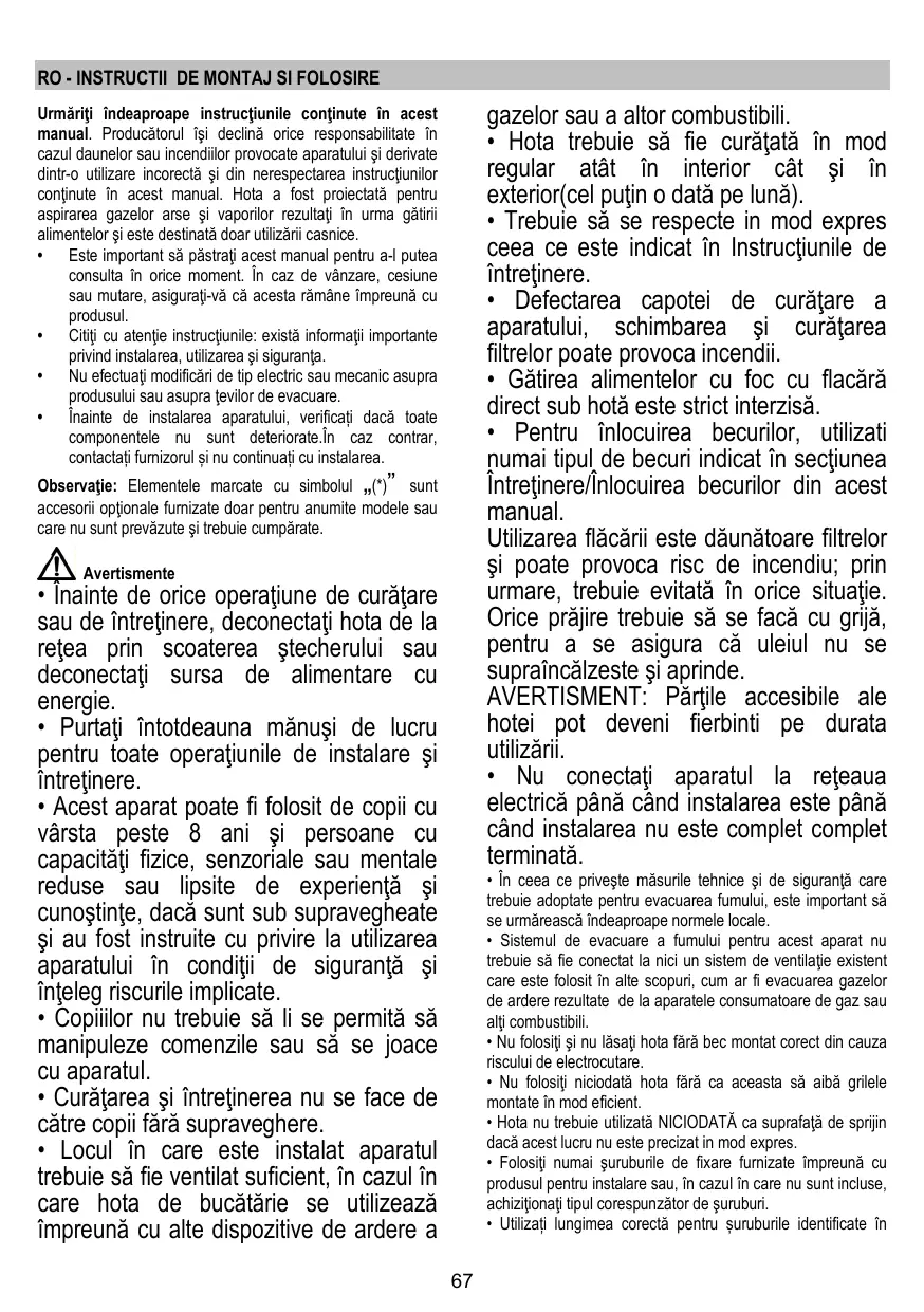 Urmăriţi îndeaproape instrucţiunile conţinute în acest manual. Producătorul îşi declină orice responsabilitate în cazul daunelor sau incendiilor provocate aparatului şi derivate dintr-o utilizare incorectă şi din nerespectarea instrucţiunilor conţinute în acest manual. Hota a fost proiectată pentru aspirarea gazelor arse şi vaporilor rezultaţi în urma gătirii alimentelor şi este destinată doar utilizării casnice. • Este important să păstraţi acest manual pentru a-l putea consulta în orice moment. În caz de vânzare, cesiune sau mutare, asiguraţi-vă că acesta rămâne împreună cu produsul. • Citiţi cu atenţie instrucţiunile: există informaţii importante privind instalarea, utilizarea şi siguranţa. • Nu efectuaţi modificări de tip electric sau mecanic asupra produsului sau asupra ţevilor de evacuare. • Înainte de instalarea aparatului, verificați dacă toate componentele nu sunt deteriorate.În caz contrar, contactați furnizorul și nu continuați cu instalarea.