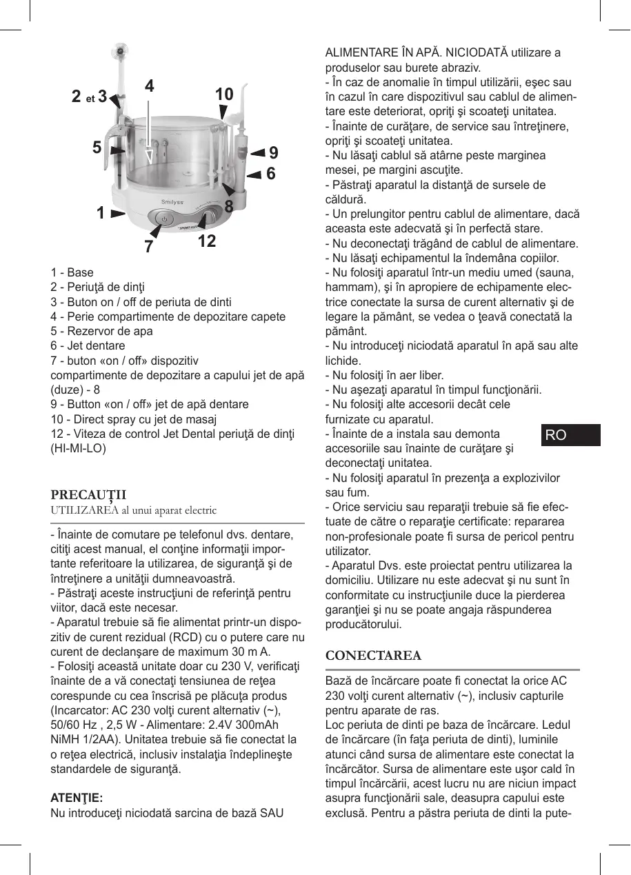 pentru a bloca timp de 16 ore. Aceastä operafiune «descärcare / reincärcäri se repetä la fiecare sase luni. Notë: Când aparatul incepe sa de descärcare de gestiune, periuta de dinfi se opreste automat de lucru pentru a preveni baterille de la descärcare complet. Ea trebuie sä se bazeze apoi unitatea pe baza acesteia pentru reîncärcare. Dupä efectuarea operaliunii «descärcare / reincärcärii» descris mai sus, putefi utiliza periuta de dinti. - Setafi capul pensula pe periuta de dinti. - Înainte de prima utilizare a unui cap perie, se clateste bine perie sub apä. - Aplicati pasta de dinti obisnuita pe perie. - Clateste-ti gura. - Pentru a evita stropirea: Locul pensula la un unghi de dinti, apoi pune pe periuta de dinti (butonul de pe mânerul periuta de dinti in timp ce te afl la o vitezä mai mici-albastru primul LED ‘s brichetä). - Treceti peria pe dinti de sus în jos. Ghidul este de-a lungul interioare si exterioare se confruntä, de asemenea, avänd grià pentru a curäta gingii- lor. Nu este necesar sà apäsafi tare pe pensula. Curätati suprafetele laterale si de pe dinti cu o miscare de räsucire. - Dacä doriti sä faceti upgrade la o vitezä mai mare apäsare a butonului de pe mâner de periuta de dinti (viteza turbo - 2 LED-uri albastre sunt aprinse) si apoi sä meargä la masai gingii apäsafi incä o datä un singur LED albastru aprins partea de sus a periei). - Pentru a opri periuta de dinti apäsafj din nou butonul (toate LED-urile off). - Timer se va opri automat dupä 2 minute perie. - Clëtifi bine gura dupa periaj. - În primele câteva utilizäri, gingiile pot sangera un pic mai ales dacä acestea sunt foarte sensi- bile, dupä câteva zile utilizare, sängerarea trebuie sä inceteze. Dacä gingille continua sa sangereze dupa cateva zile de utilizare, vä recomandäm sä consultafi un stomatolog. Metoda de curatare este cel mai eficient de a transmite usor perie un dinte la altul, färä sprijin. Forma modificärilor perie ca si atunci când utilizare, care este destul de normal si, de asemenea, depinde de modul dumneavoasträ personale de speli pe dinti. Aceasta deformare nu afecteazä eficacitatea perie. Dar amintifi-vä pentru a schimba cap perie ca o periufä de dinti manual regulat. - Dupä utilizarea periuta de dinti, clätiti capul perie sub apä. - inlocuieste periuta de dinti pe bazä de incärcare.