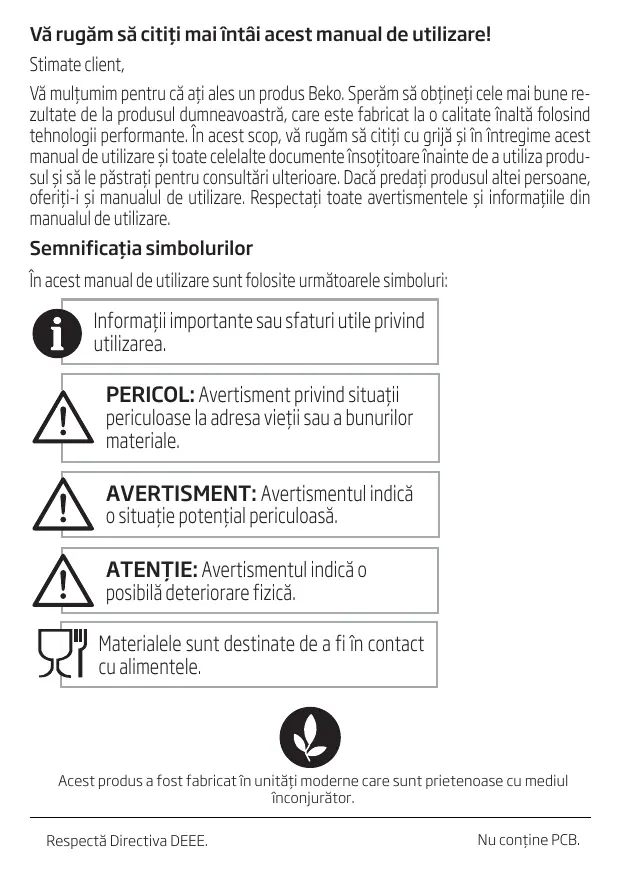 Vé multumim pentru cà ati ales un produs Beko. Speräm sé obtineti cele mai bune re- zultate de la produsul dumneavoastré, care este fabricat la o calitate înalté folosind tehnologii performante. in acest scop, vé rugäm së cititi cu grijà si în intregime acest manual de utilizare si toate celelalte documente insotitoare inainte de a utiliza produ- sul si sé le péstrati pentru consultéri ulterioare. Dacé predati produsul altei persoane, oferiti-i si manualul de utilizare. Respectati toate avertismentele si informatiile din manualul de utilzare