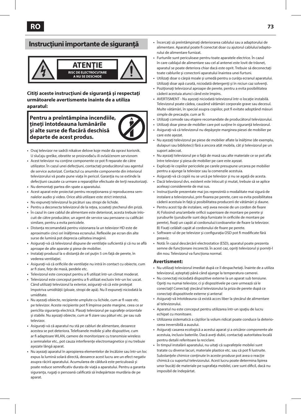 Ne placez pas d'objets, de récipients remplis de liquide, comme des vases, ete. sur la télévision. Ces récipients pourraient tre renversés, ce qui mettrait en danger la sécurité électrique. Placer la TV exclusivement sur des surfaces plates et stables, Ne placer aucun objet tel qu'un journal ou une couverture, etc. sur ou sous la TV.