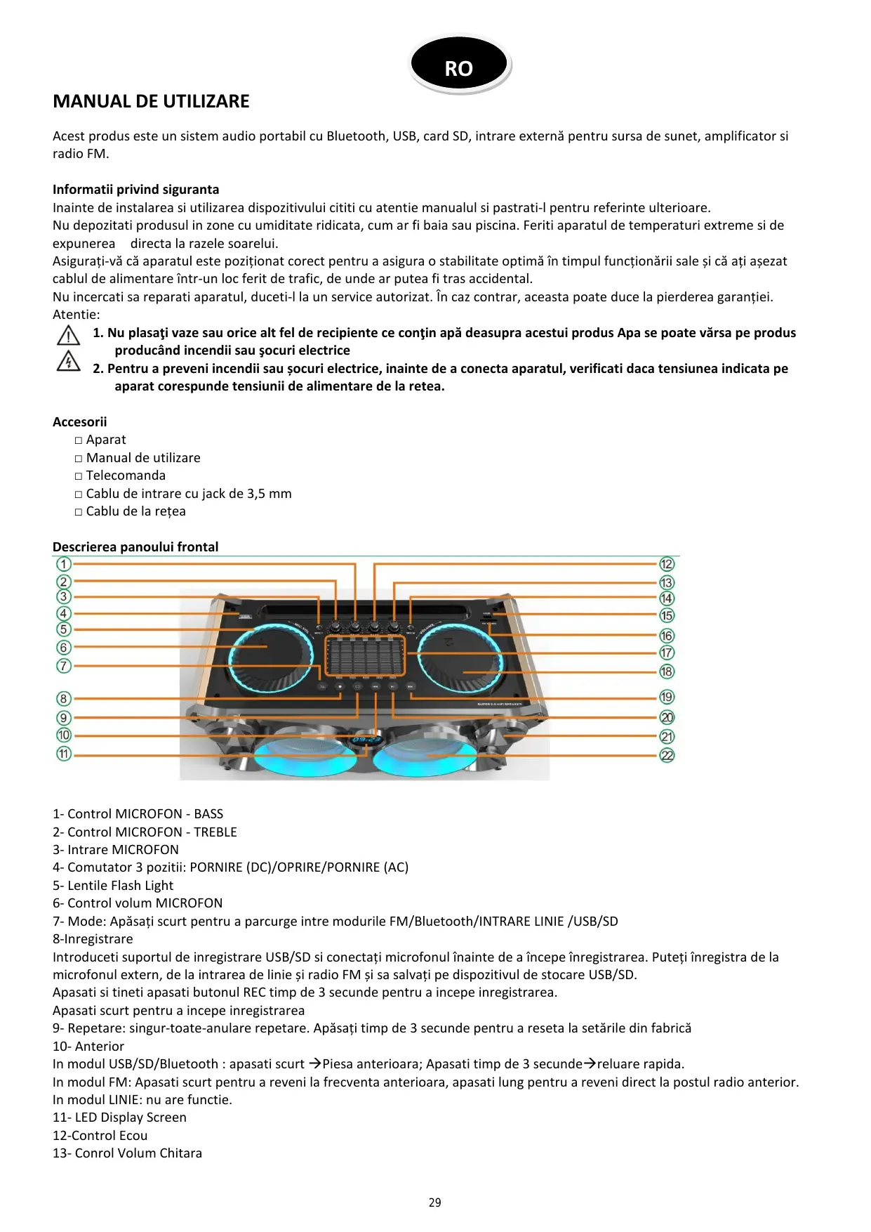 Dimensiuni: 50 x 22.5 x 21.5cm Greutate: 6,8kg Designul produsului si specificatiile pot fi modificate färä notificare prealabiläl Depanare PROBLEMA CAUZA POSIBILA SOLUTIA Nu se aude nimic la 1: Nici o sursa audio nu este conectata 1: Conectati o sursa audio iesire 2: Volumul a fost redus la minim 2: Reglati volumul 3: Nu este introdus stick/card USB/SD 3: Introduceti un stick/card USB/SD Distorsiune de sunet | 1: Volum prea mare 1:Reduceti volumul 2: Eroare de fisier audio 2:Verificati si schimbati fisierele audio Microfon fara sunet 1: Microfonul nu este conectat 1: Conectati complet microfonul 2: Microfonul nu este pornit 2:Porniti microfonul 3: Volumul microfonului a fost redus la 3: Reglati volumul microfonului minim Nu exista sunet la 1: Format incompatibil 1:Format melodiilor trebuie sä fie MP3 / WMA redarea de pe cardul | 2: Nu se porneste redarea 2: Opriti, apoi reporniti USB/SD 3: Cardul USB/SD nu este introdus corect | 3: Introduceti cardul corect USB/SD Probleme FM Radio 1:Nu se pot cäuta posturi de radio 1: Antena FM nu este deschisa la maxim 2: nu exista sunet la radio FM 2: Comutati la canalul urmätor si reincercati 3: Prea putine canale FM 3: Repozitionati antena FM la un unghi diferit 4: Sunet FM neclar 4: Repozitionati antena FM sau sä încercatio "scanare automatä" Zgomote in difuzor 1: Microfonul cu fir este prea aproape 1:Nu lasati microfonul aproape de difuzor de difuzor - diafonie 2: Microfonul cu fir este pornit dar nu 2: Opriti microfonul care nu este utilizat este utilizat. 3: Volum prea mare microfon 3: Reduceti volumul microfonului. 4: Telefon mobil prea aprope de difuzor | 4: Pastrati telefonul mobil departe de difuzor in timpul convorbirii 5: Prea aproape de echipamente care 5: Pästrati difuzorul departe de alte surse de interferentä. interfera difuzorul