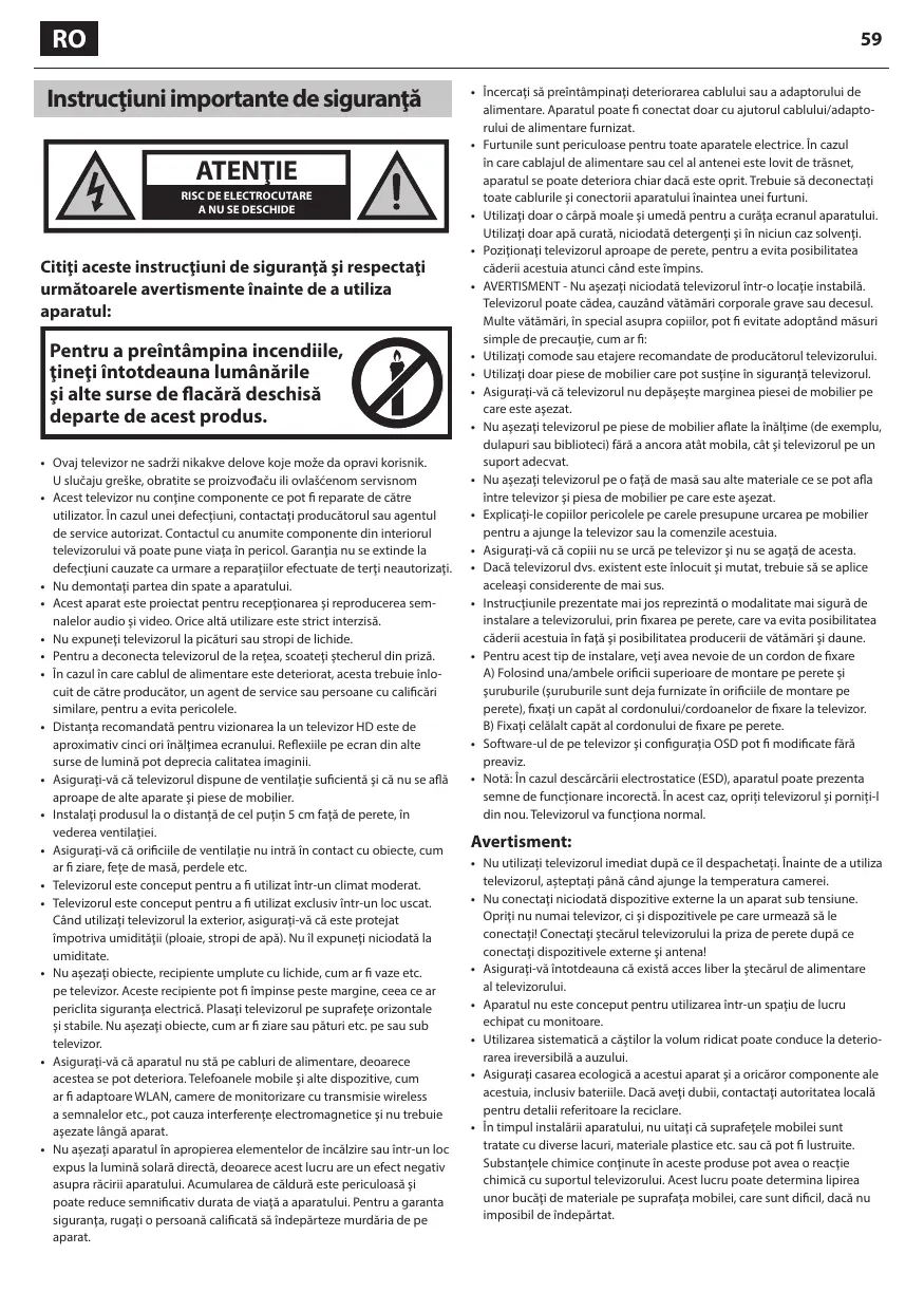 Ne placez pas d'objets, de récipients remplis de liquide, comme des vases, etc... sur la télévision. Ces récipients pourraient être renversés, ce qui mettrait en danger la sécurité électrique. Placer la TV exclusivement sur des surfaces plates et stables. Ne placer aucun objet tel qu'un journal ou une couverture, etc, sur ou sous la TV.
