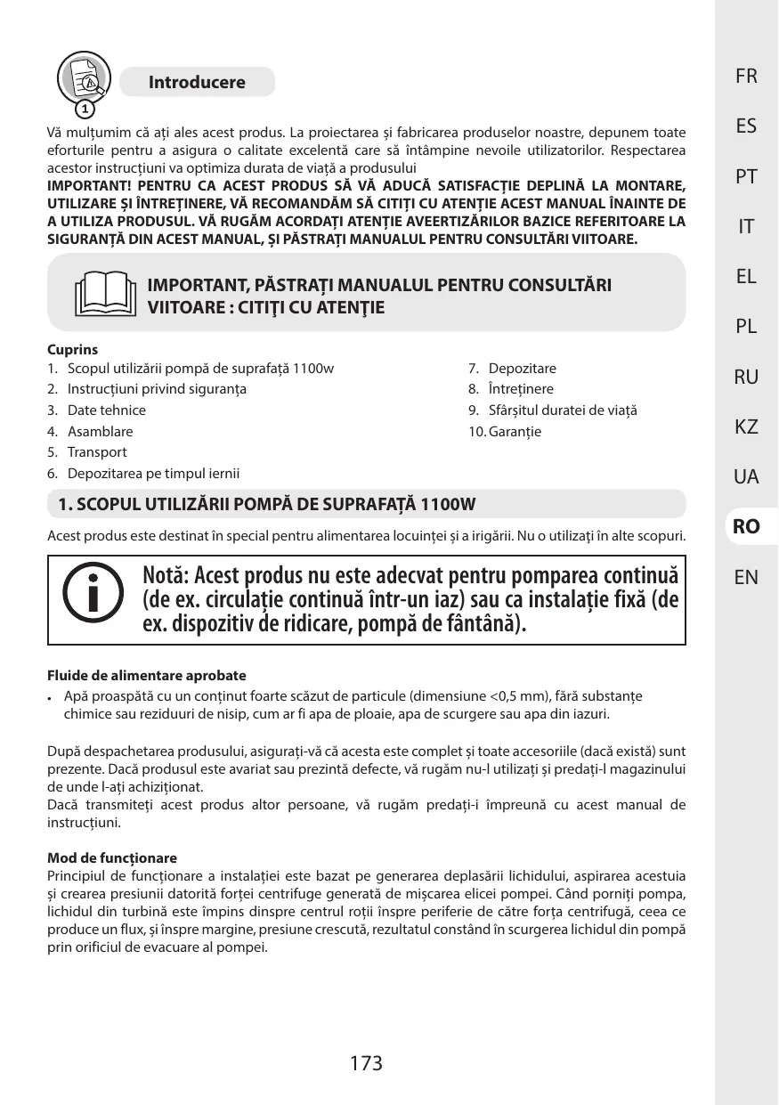 1. SCOPUL UTILIZARII POMPÀ DE SUPRAFATÀ 1100W Acest produs este destinat in special pentru alimentarea locuintei si a irigärii. Nu o utilizati in alte scopuri.