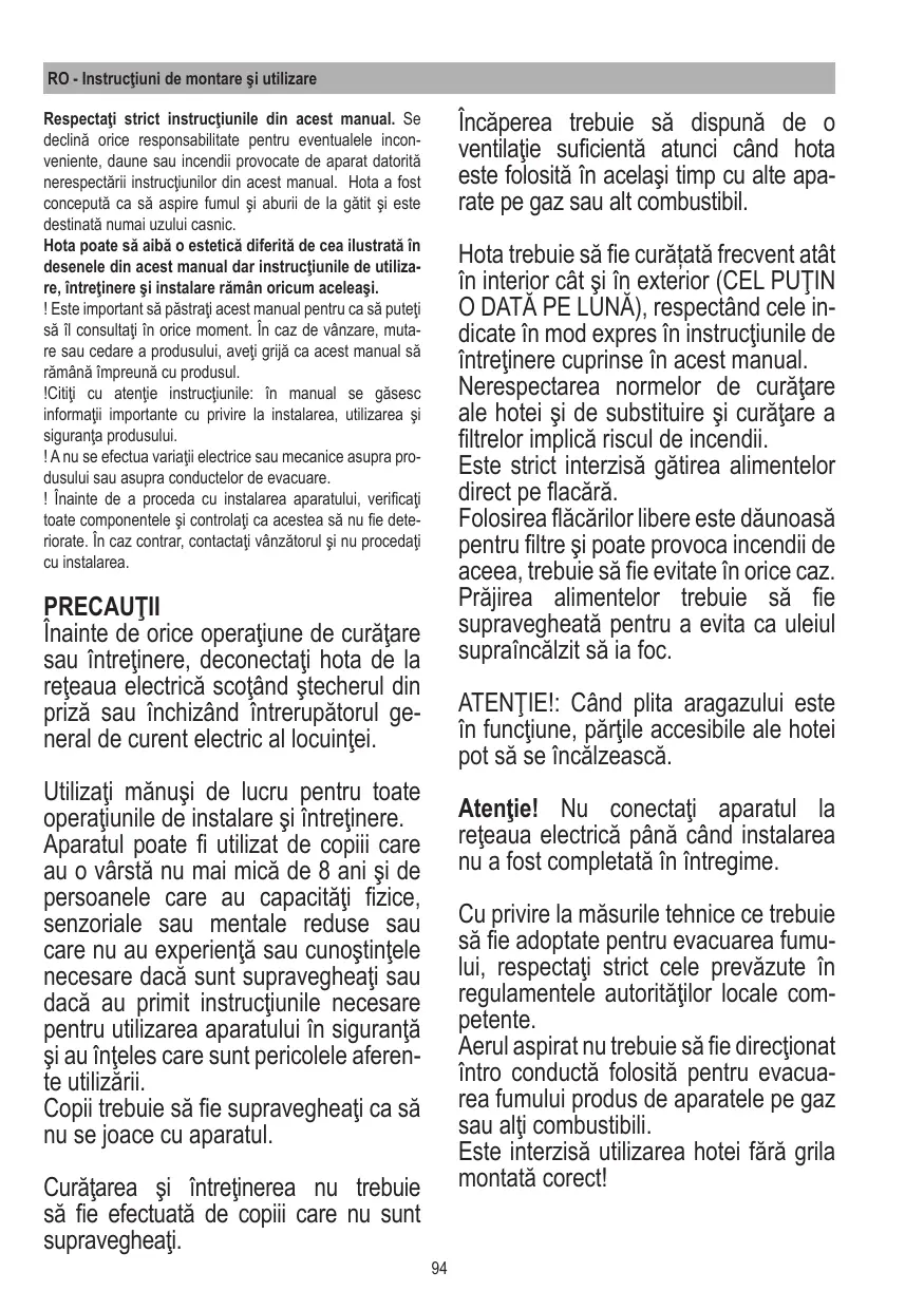 La hotte ne doit JAMAIS être utilisée comme un support, sauf indication con- traire.