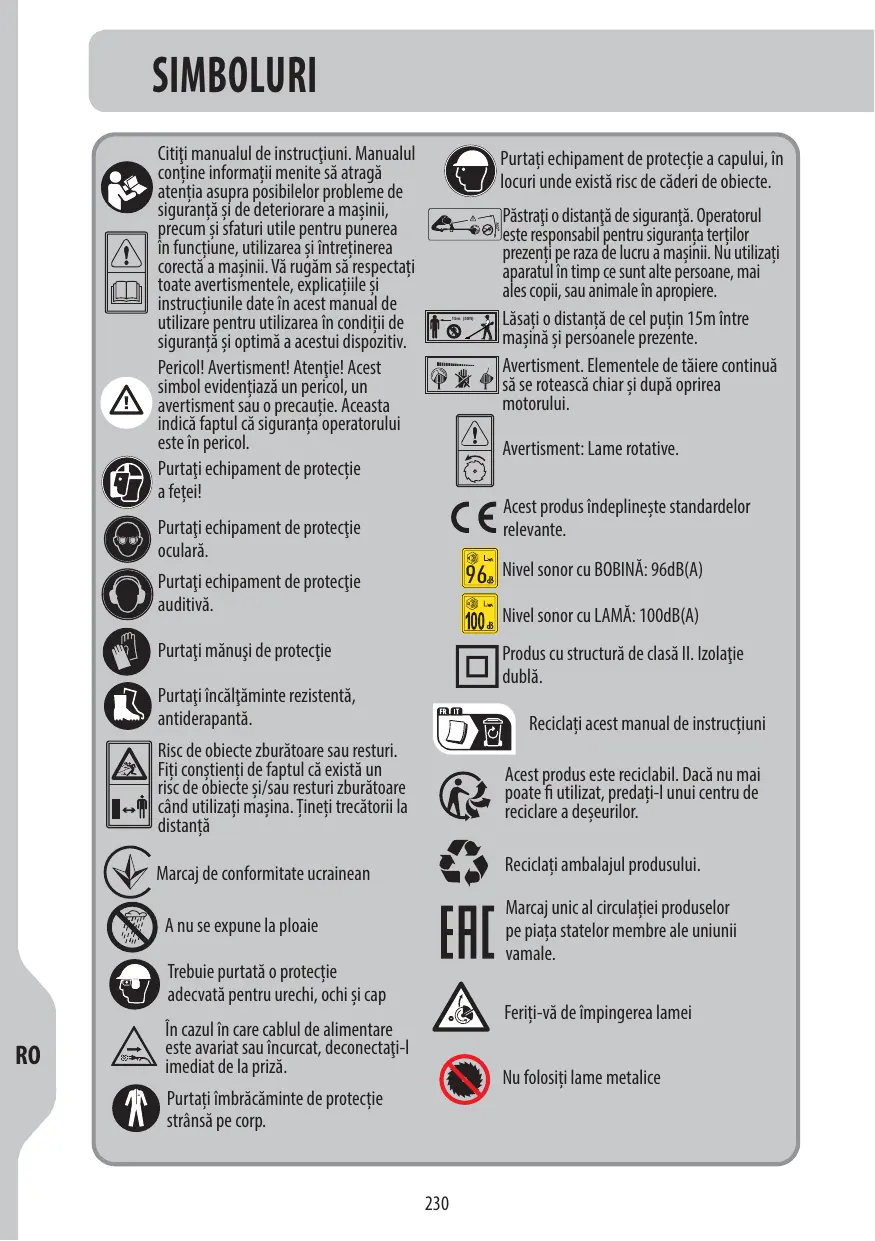SIMBOLURI Gititi manualul de instructiuni. Manualul contine informatii menite sà atragä atentia asupra posibilelor probleme de igurantä si de deteriorare a masini, precum si Sfaturi utile pentru punerea in functiune, utilizarea si intretinerea corectä a masinii. Vä rugäm sà respectati toate avertismentele, explicatiile si instructiunile date în acest manual de utilizare pentru utilizarea în conditii de sigurantä si optimä a acestui dispozitiv. Pericol! Avertisment! Atentie! Acest simbol evidentiazä un pericol, un VAN avertisment sau o precautie. Aceasta indicà faptul cà siguranta operatorului este în pericol.