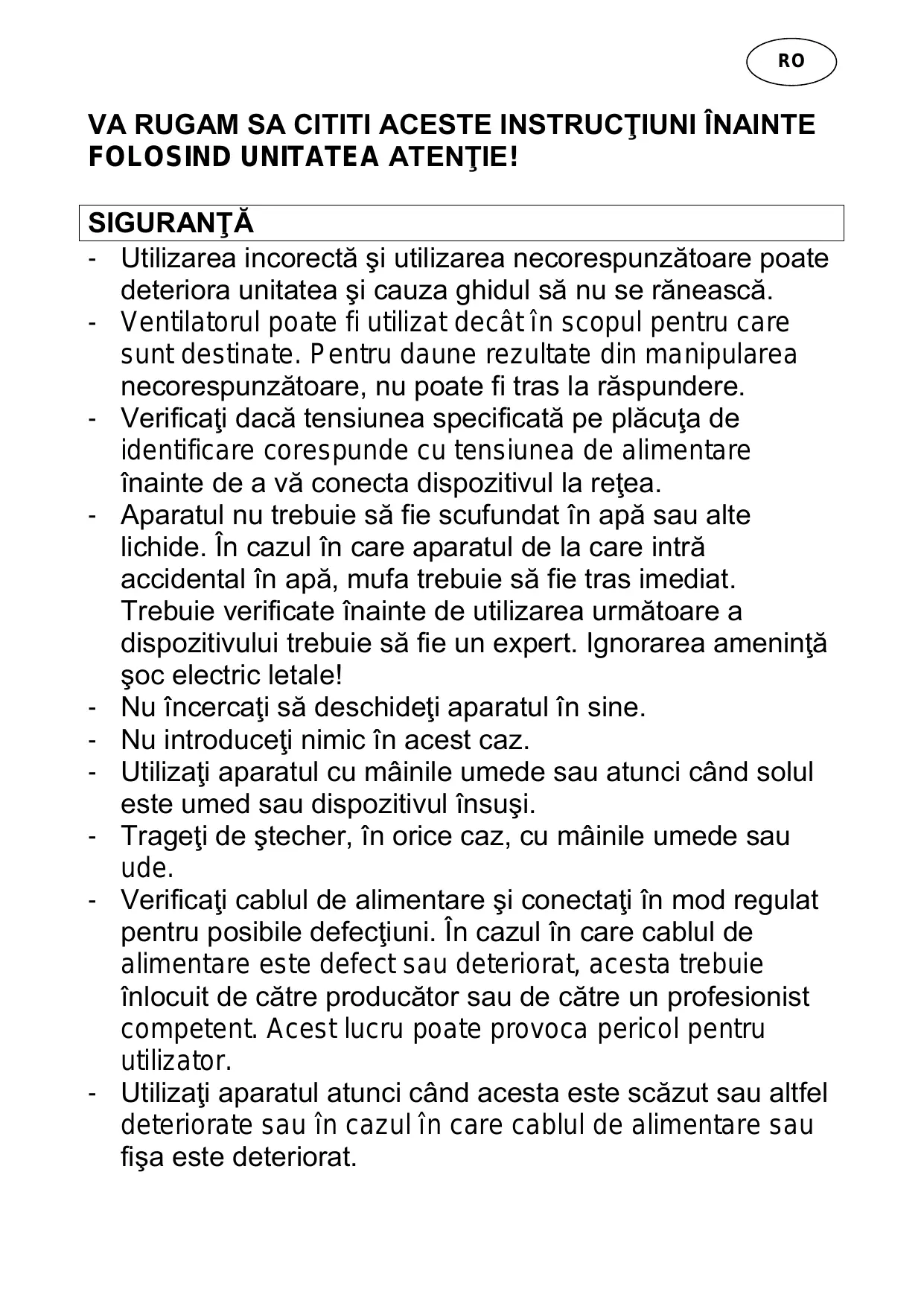VA RUGAM SA CITITI ACESTE INSTRUCTIUNI ÎNAINTE FOLOSIND UNITATEA ATENTIE! SIGURANT À -_ Utilizarea incorectä si utilizarea necorespunzätoare poate deteriora unitatea si cauza ghidul sà nu se räneascä. -_Ventilatorul poate fi utilizat decât în scopul pentru care sunt destinate. Pentru daune rezultate din manipularea necorespunzätoare, nu poate fi tras la räspundere. -_ Verificati dacä tensiunea specificatà pe pläcuta de identificare corespunde cu tensiunea de alimentare înainte de a vä conecta dispozitivul la retea. -_ Aparatul nu trebuie sä fie scufundat în apä sau alte lichide. În cazul în care aparatul de la care inträ accidental în apä, mufa trebuie sä fie tras imediat. Trebuie verificate fnainte de utilizarea urmätoare a dispozitivului trebuie sä fie un expert. Ignorarea amenintä soc electric letale! -_ Nu fncercati sä deschideti aparatul în sine. -_ Nu introduceti nimic în acest caz. -_ Utilizati aparatul cu mâinile umede sau atunci când solul este umed sau dispozitivul însusi. -_ Trageti de stecher, în orice caz, cu mâinile umede sau ude. -_ Verificati cablul de alimentare si conectati îÎn mod regulat pentru posibile defectiuni. În cazul în care cablul de alimentare este defect sau deteriorat, acesta trebuie înlocuit de cätre producätor sau de cätre un profesionist competent. Acest lucru poate provoca pericol pentru utilizator. -_ Utilizati aparatul atunci când acesta este scäzut sau altfel deteriorate sau în cazul în care cablul de alimentare sau fisa este deteriorat.
