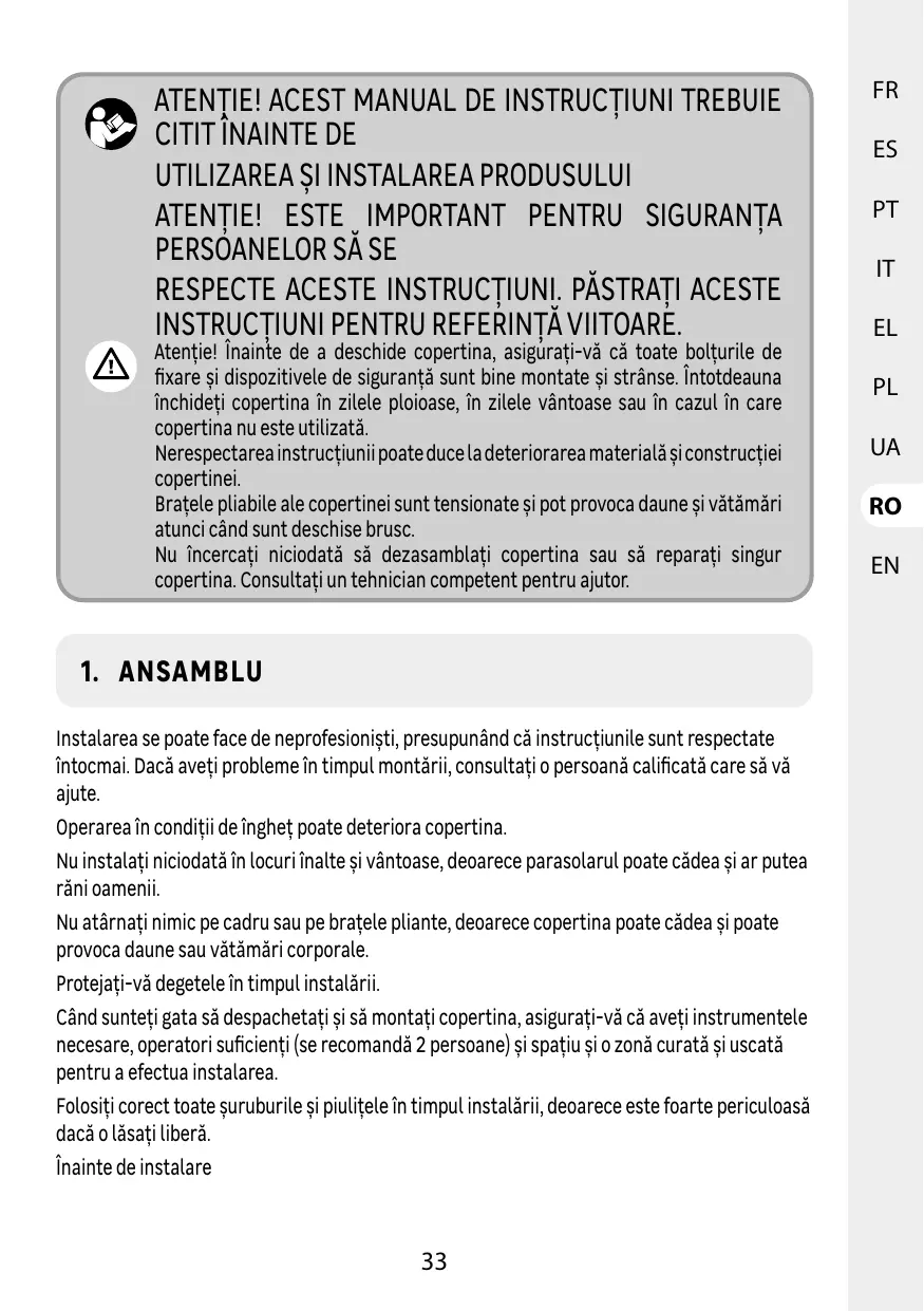1. MONTAGE L'installation peut être effectuée par des personnes non professionnelles à condition que Les instructions soient correctement suivies. En cas de problème au cours de l'assemblage du store, veuillez faire appel à une personne qualifiée pour obtenir de l'assistance.