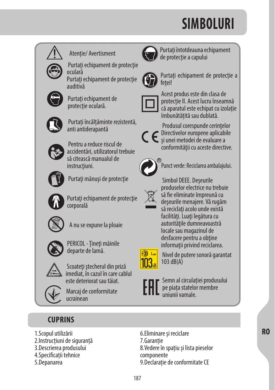 1.Domaine d'utilisation 6.Mise au rebut et recyclage 2.Consignes de sécurité 7.Garantie 3.Description de votre outil 8.Vue éclatée et liste des pièces 4.Spécifications techniques 9.Déclaration de conformité CE