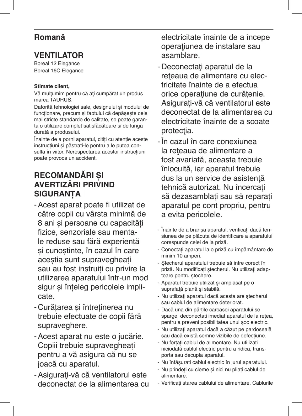 BOREAL 16C ELEGANCE - Ventilator TAURUS - Notice d'utilisation et mode d'emploi gratuit