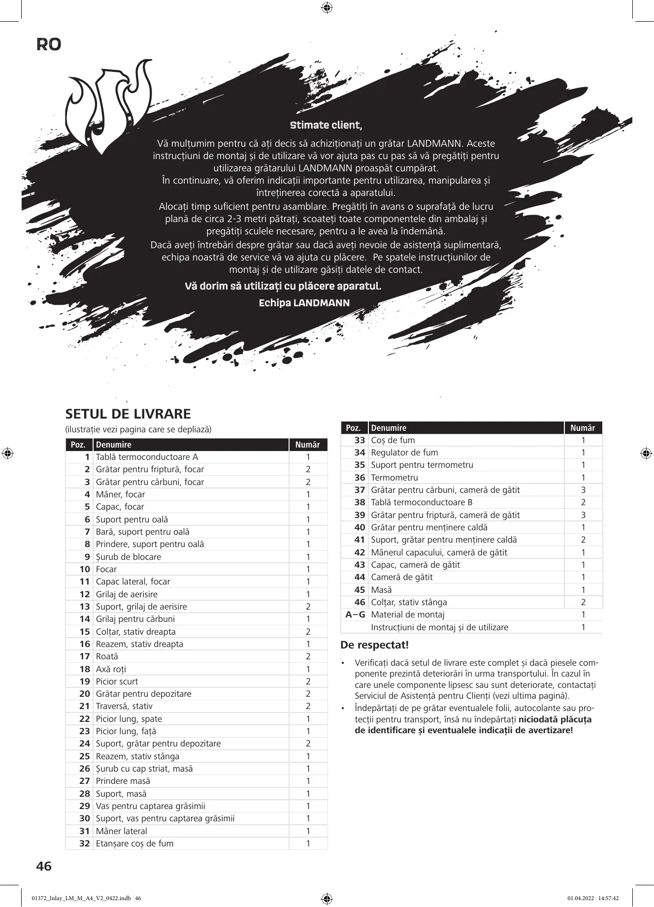 7 Tige, potence pour marmite 41 Support, grille de maintien au chaud 2 8 Logement, potence pour marmite 42 Poignée du couvercle, chambre de cuisson 1 9 Vis de fixation 43 Couvercle, chambre de cuisson 1 10 Boîte de combustion 44 Chambre de cuisson 1 11 Cache latéral, boîte de combustion 45 Tablette 1 12 Grille de ventilation 46 Coude, bâti à gauche 2 13 Support, grille de ventilation A-G Matériel de montage 1 14 Grille de retenue de charbon Guide de montage et d'utilisation 1 15 Coude, bâti à droite À . 16 Montant, bâti à droite À observer : 17 Roue + Vérifiez que l'étendue des fournitures est au complet et que les 18 Essieu composants ne présentent pas de dommages imputables au
