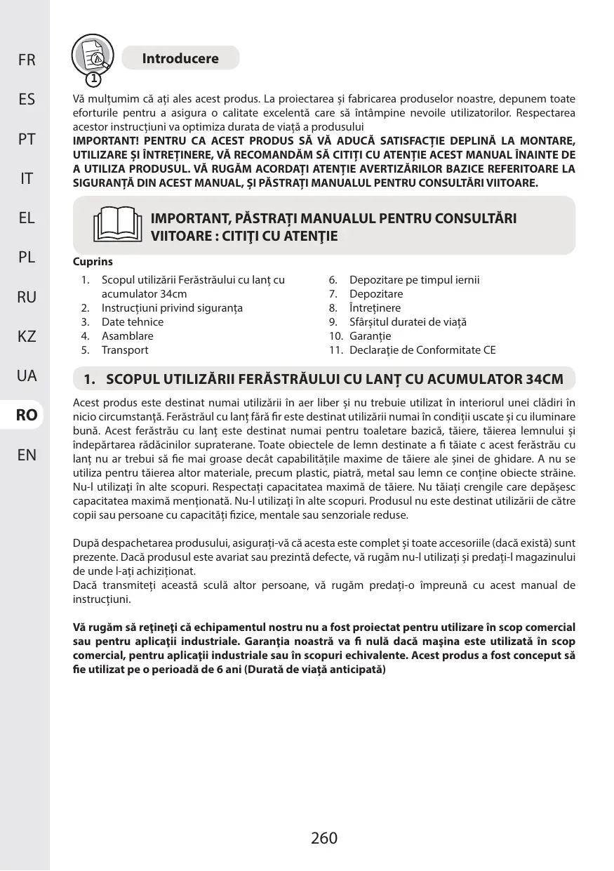 Les objets en bois destiné à être coupés avec cette tronçonneuse ne doivent en aucun cas être plus épais que la capacité de coupe maximale du guide-chaîne. Elle ne doit pas être utilisée pour couper d'autres matériaux, tels que le plastique, la pierre, le métal ou le bois contenant des corps étrangers. Ne l'utilisez pas à d'autres fins. La capacité de coupe maximale doit être respectée. Ne coupez pas des branches dépassant la capacité maximale spécifiée. Ne l'utilisez pas à d'autres fins. Le produit n'est pas destiné à être utilisé par des enfants ou des personnes aux capacités physiques, mentales ou sensorielles réduites.