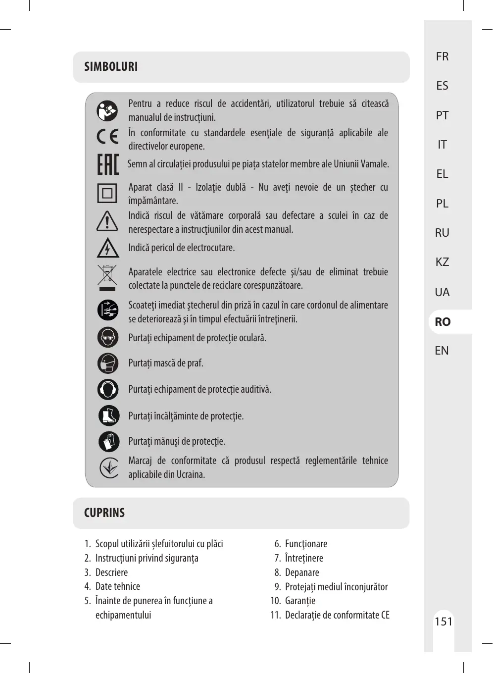 EN 61000-3-2:2014; EN 61000-3-3:2013 IEC 62321-1:2013; IEC 62321-2:2013 1EC62321-3-1:2013; IEC 62321-4:2013--AMD1:2017 CSV IEC 62321-5:2013; IEC 62321-6:2015 IEC 62321-7-1:2015; IEC 62321-7-2:2017 IEC 62321-8:2017; ISO 17075:2017 Dacä periile de cärbune trebuie sà fie inlocuite, aceastä operatie trebuie efectuatà de 0 persoanà calificatä in reparatii (se vor inlocui intotdeauna ambele perii in acelasi timp).