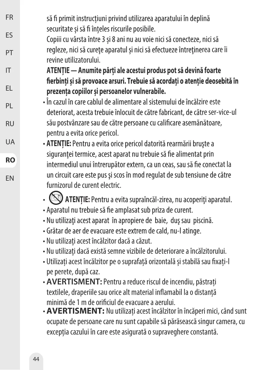 + Ne pas utiliser cet appareil de chauffage à proximité d'une baignoire, d'une douche ou d'une piscine.